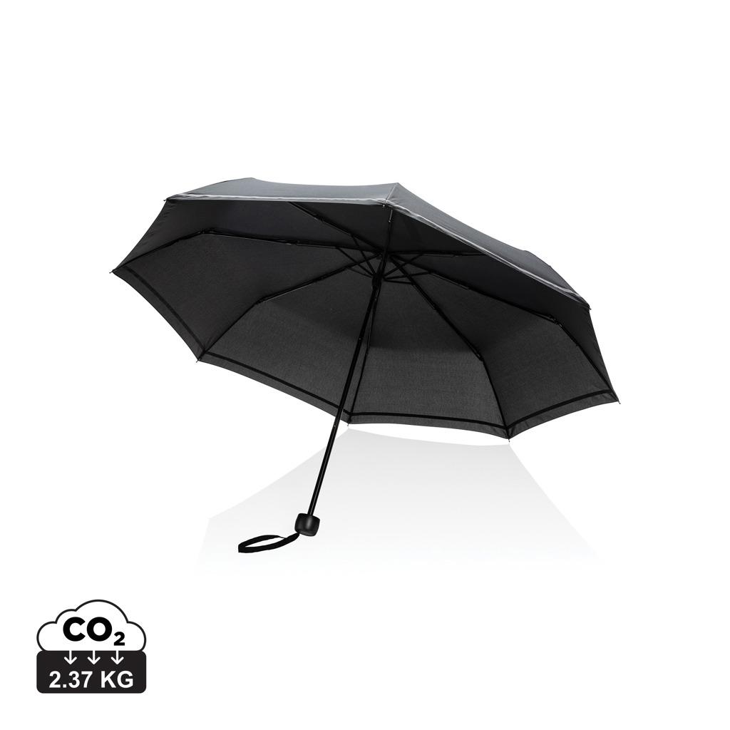 Mini-parapluie à ouverture manuelle en 3 parties. Restez visible la nuit grâce à la bande réfléchissante. Mât métallique, baleines en fibre de verre et poignée en PP. Ce parapluie a économisé 4,5 litres d'eau et est fabriqué à partir de 7,6 bouteilles PET (500ml).