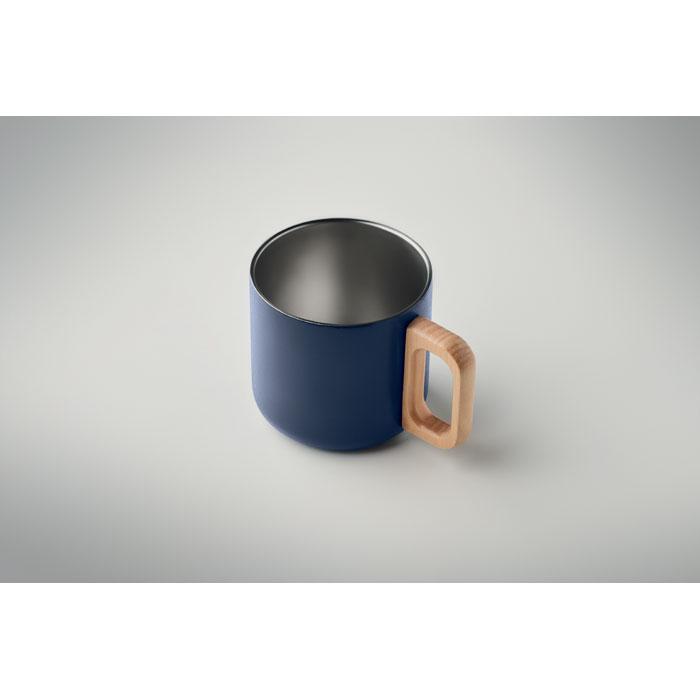 Mug à double paroi en acier inoxydable recyclé (90 % d'acier inoxydable recyclé et 10 % d'acier inoxydable) avec poignée en bois. Capacité : 350 ml.