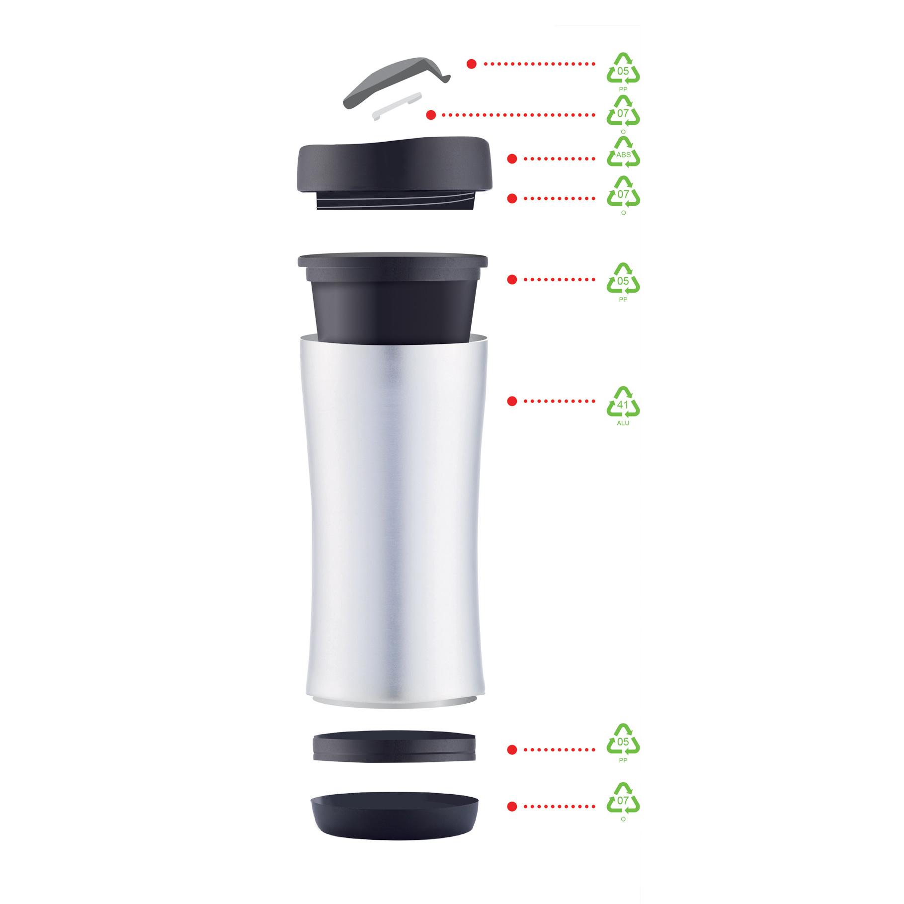Boom est un mug de voyage antifuites de 225ml à double paroi, extérieur en aluminium anodisé, intérieur en PP. Son design permet de le démonter complètement pour le recycler et garder un monde plus propre. Garde les boissons chaudes jusqu'à 3h et froides jusqu'à 6h.