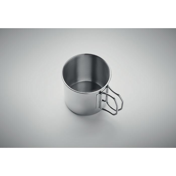 Mug en acier inoxydable à simple paroi avec poignée pliable. Capacité : 330 ml.