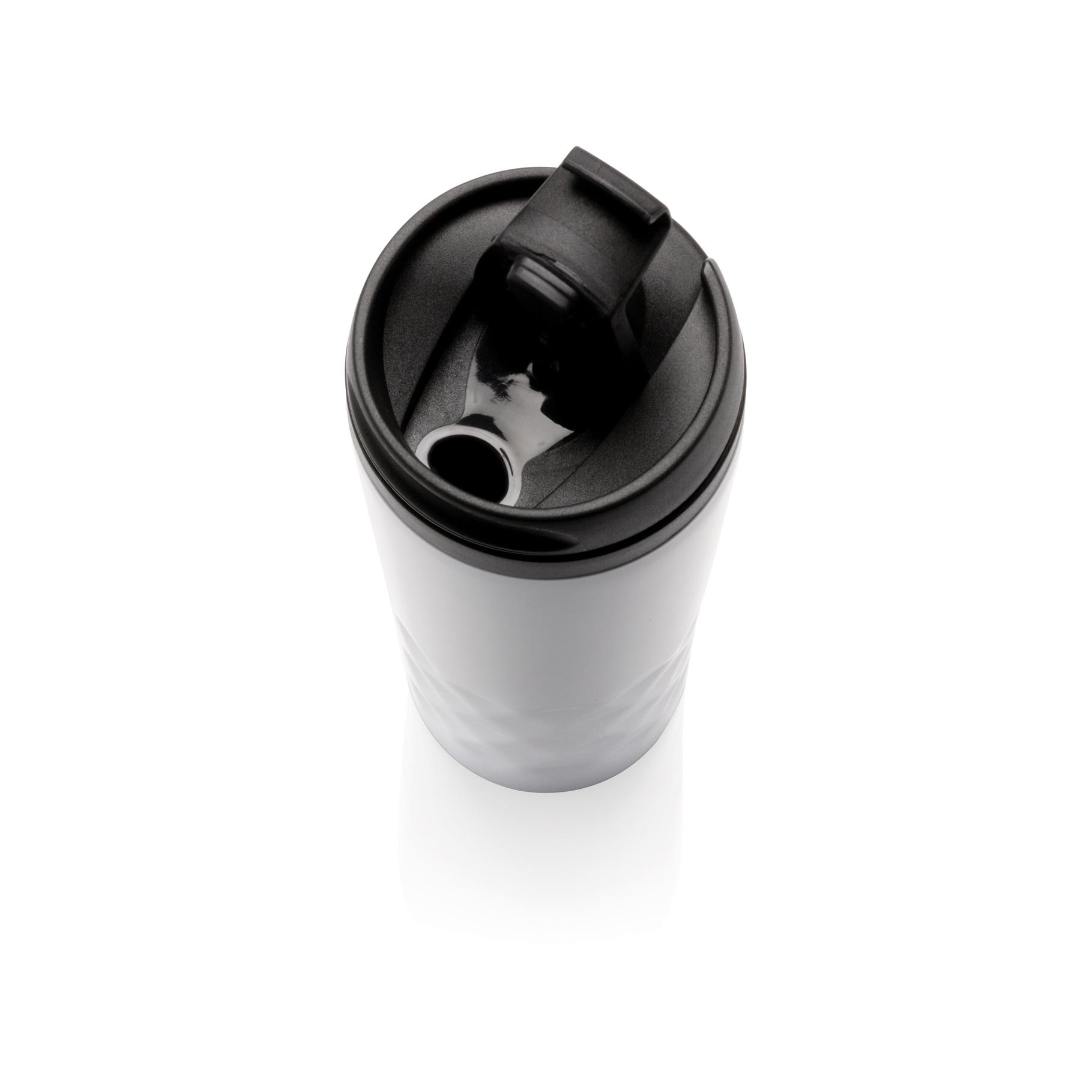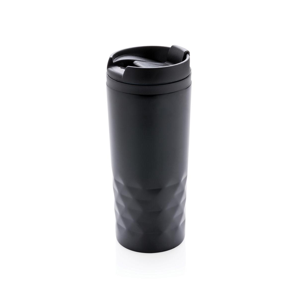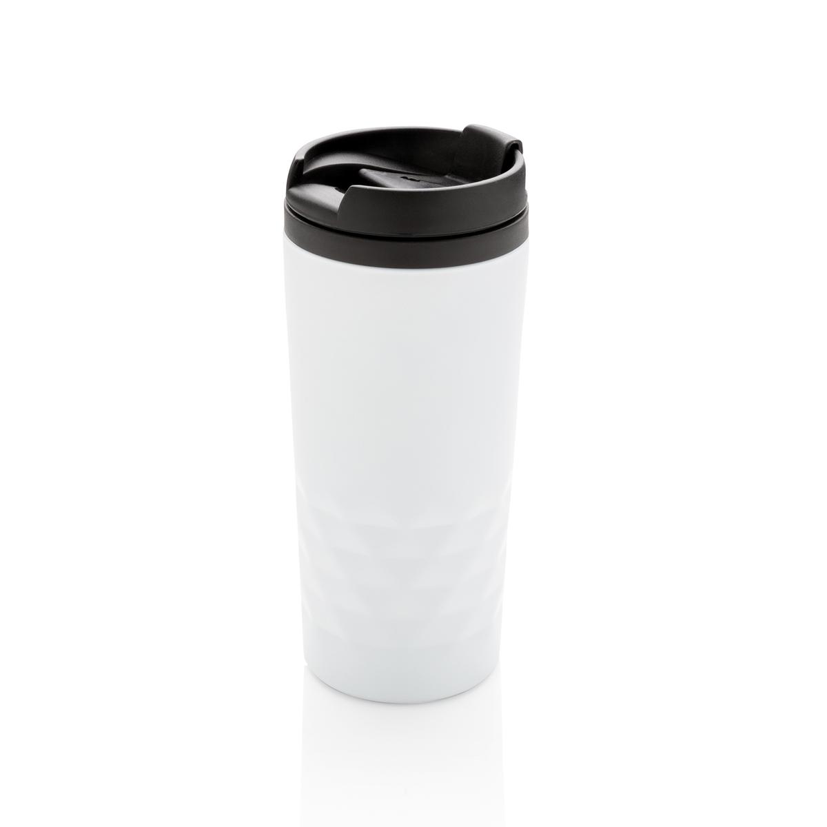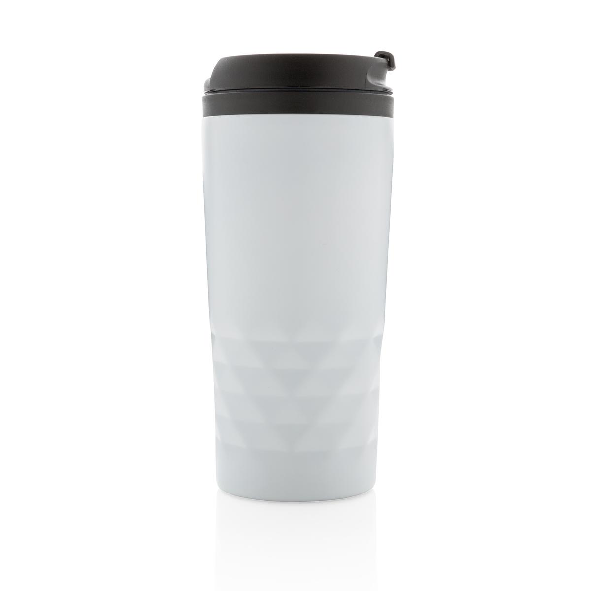 Mug 300ml avec détails géométriques, intérieur en plastique et extérieur en acier inoxydable.