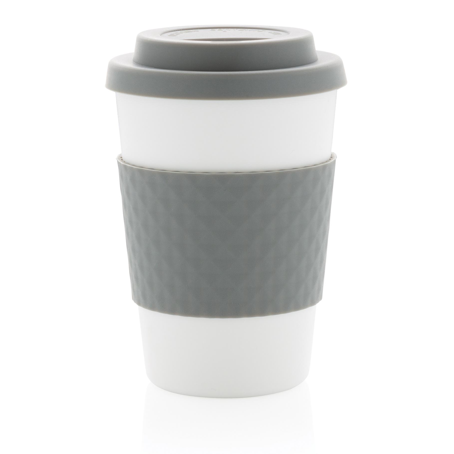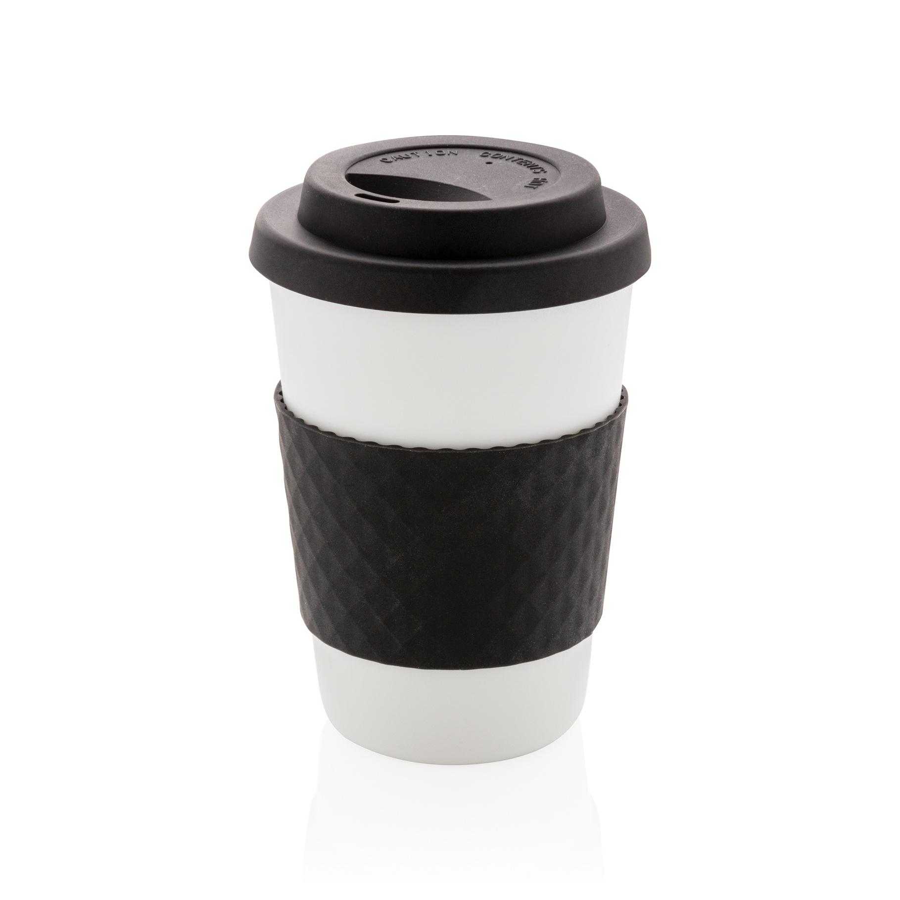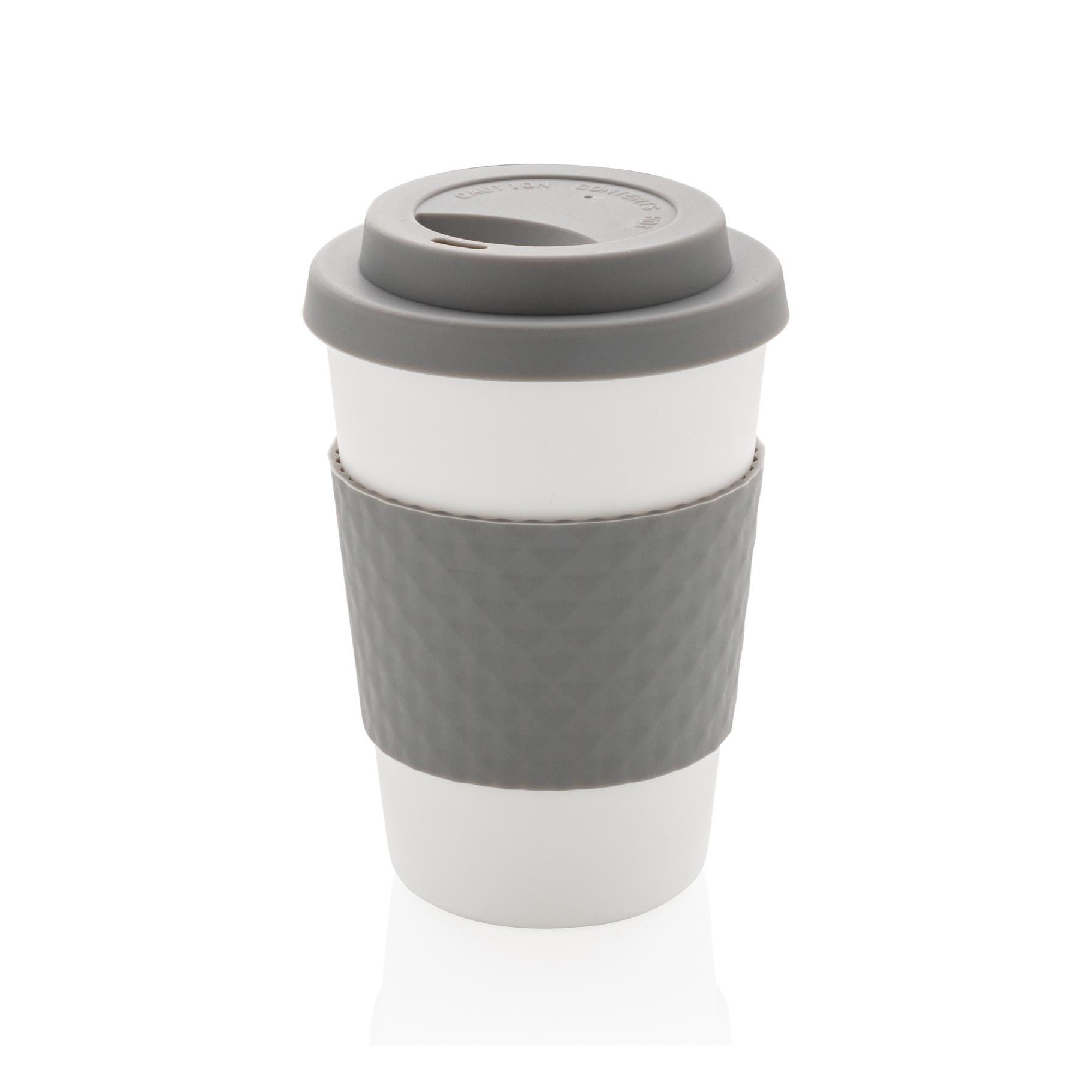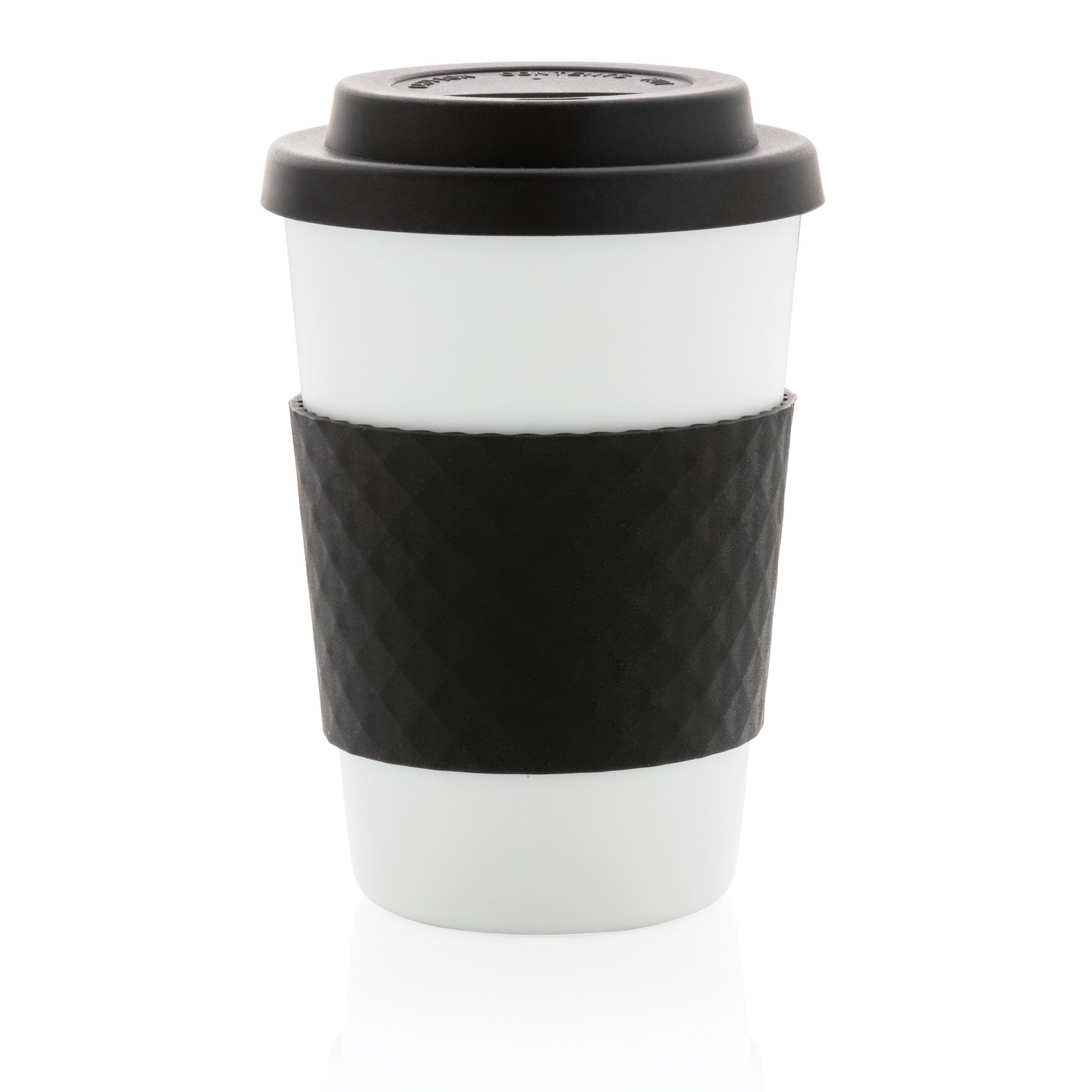 Mug 270ml en PP. Stop à l'usage unique ! Apportez votre propre mug et rejoignez la révolution de la réutilisation pour contribuer à un monde sans produits jetables. Usage alimentaire jusqu'à 100 degrés Celsius. Avec couvercle et bandeau de protection en silicone. Passe au lave-vaisselle et au micro-ondes. Passe facilement sous la plupart des machines à café.