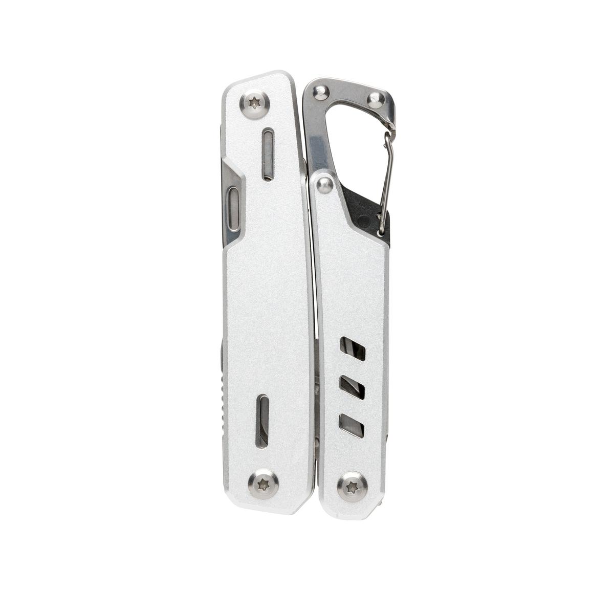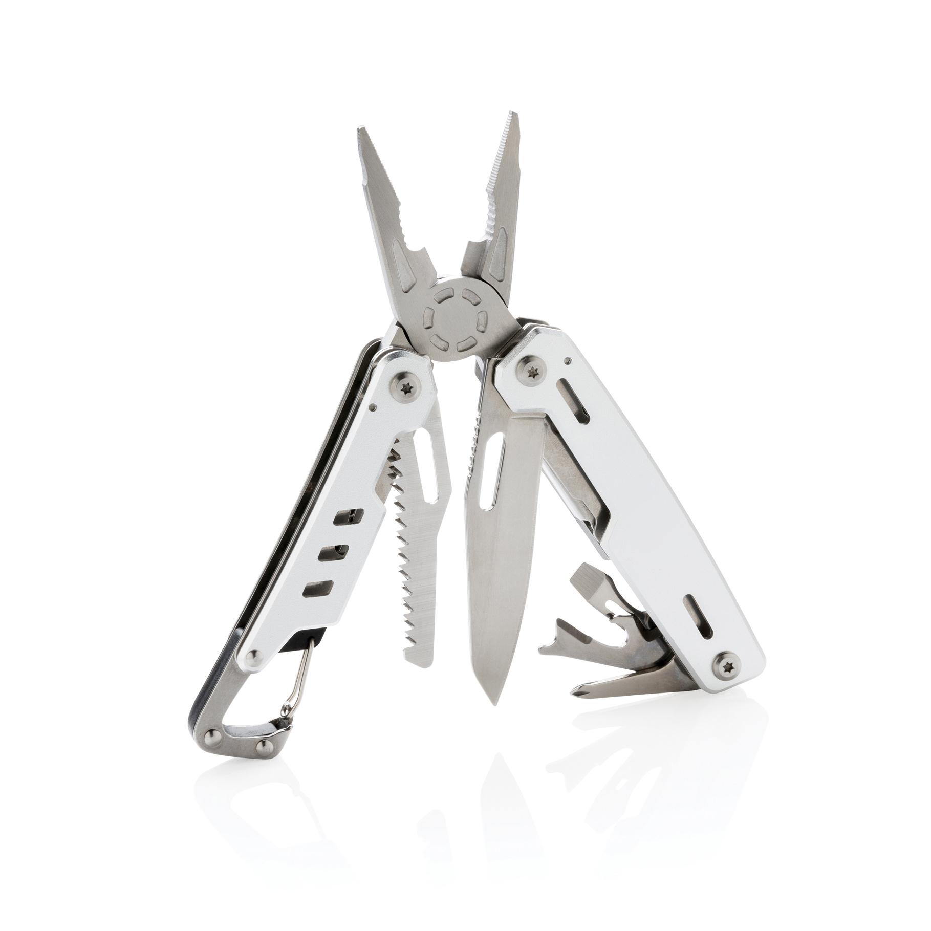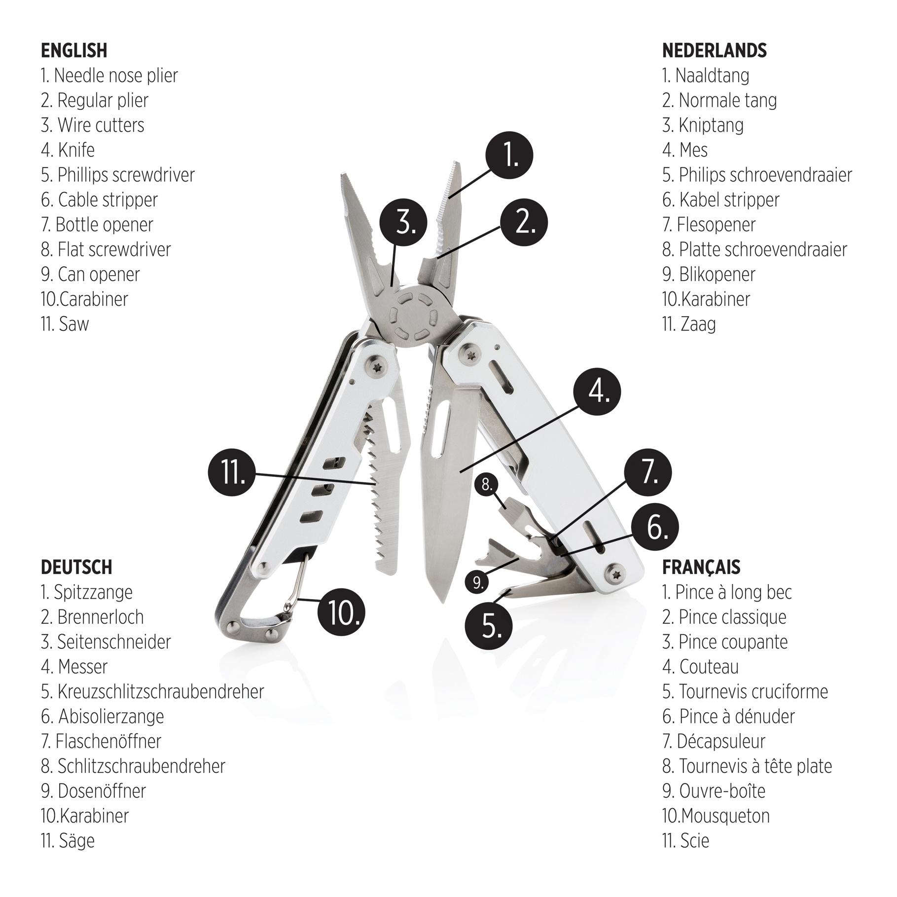 Outil multifonctions robuste en aluminium avec 11 fonctions. Les outils en acier inoxydable sont: pince à bec, pince, pince coupante, couteau, tournevis cruciforme, tournevis plat, scie, ouvre-boîte, ouvre-bouteille, décapsuleur, mousqueton, pince à dénu