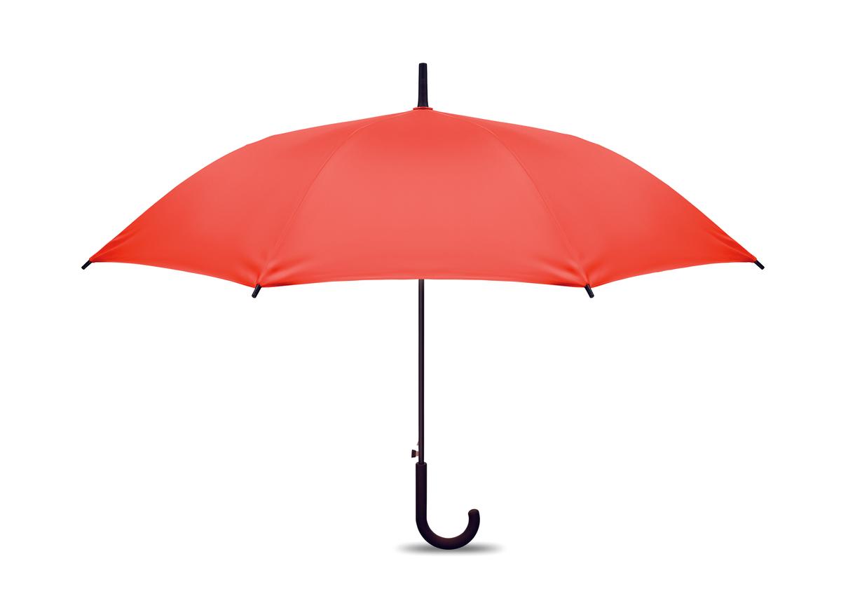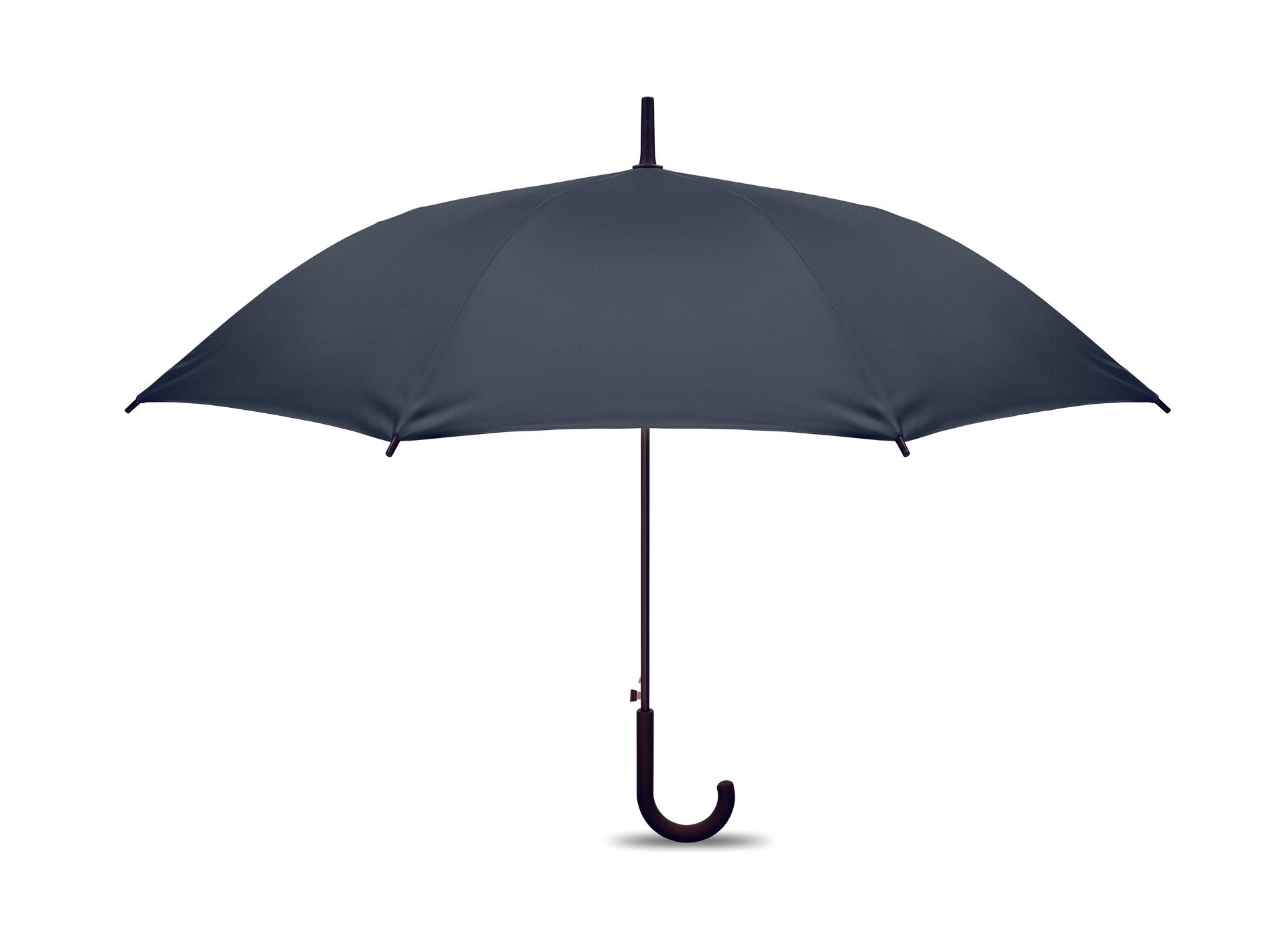 Parapluie droit 23 pouces avec armature en métal plaqué noir, baleines en fibre de verre et panneaux en tissu pongé 190T. Embouts et pointe en plastique. Poignée courbe en plastique PP caoutchouté. Ouverture automatique et fermeture manuelle.