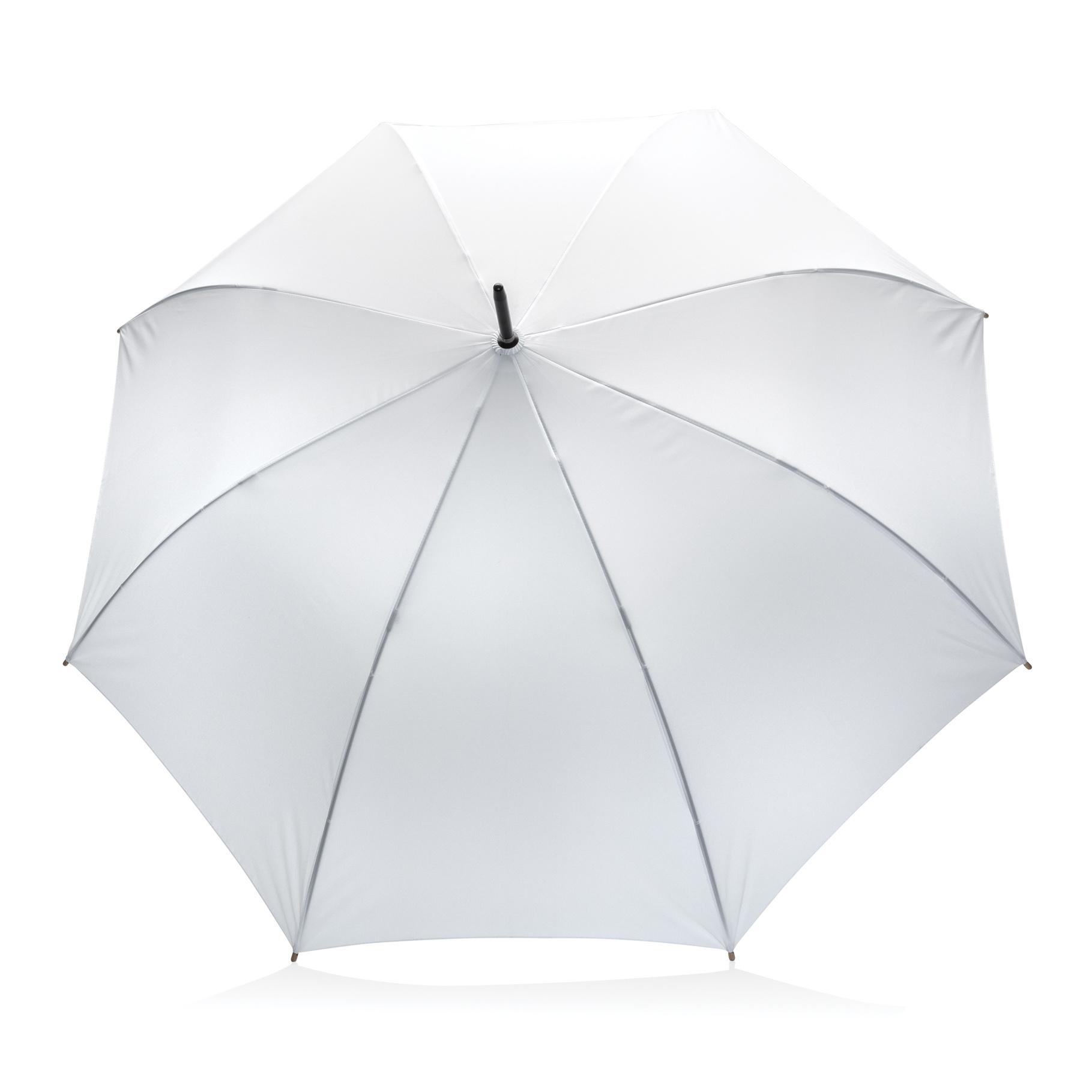 Parapluie de 27 pouces à ouverture automatique. Mât en métal, baleines en fibre de verre et poignée élégante en bambou. Ce parapluie a économisé 6,3 litres d'eau et est fabriqué à partir de 10,7 bouteilles PET (500ml).