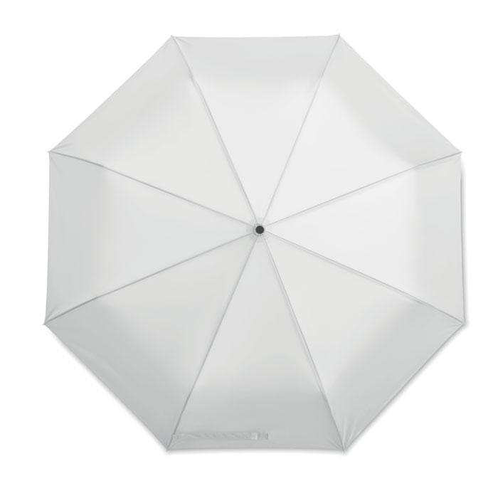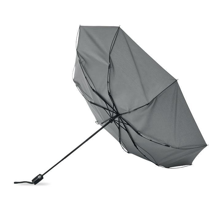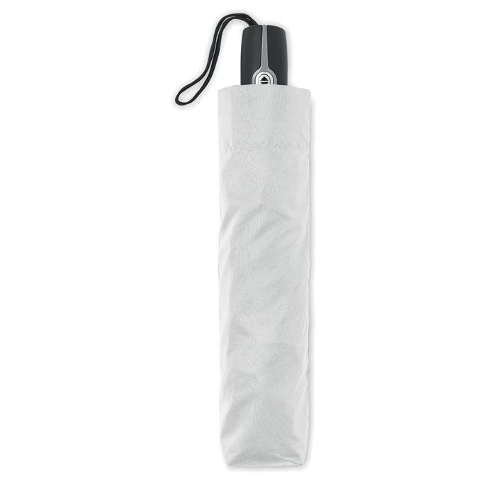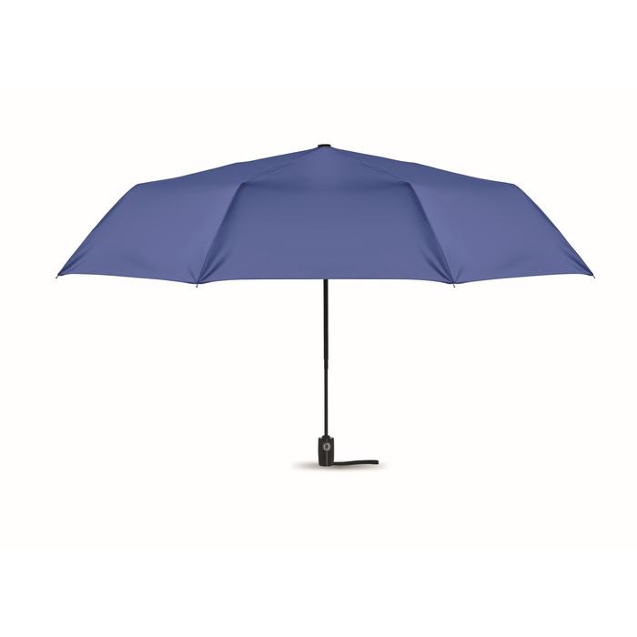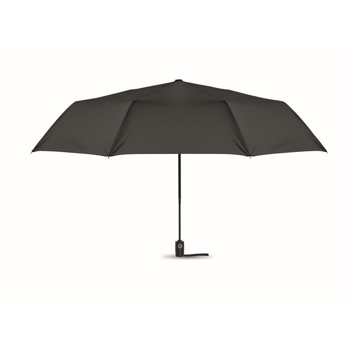 Parapluie tempête de 27 pouces, 3 plis, ouverture/fermeture automatique. Tissu en pongé 190T, mât en acier plaqué noir. Baleines en fibre de verre, revêtement intérieur noir en 1 partie. Poignée en PP noir avec bouton. Avec pochette assortie.