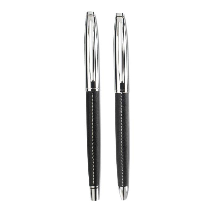 Parure stylos bille/roller. Présentation pochette PU à fermeture éclair, couleur assortie et couture contrastée. Encre bleue et noire respectivement..