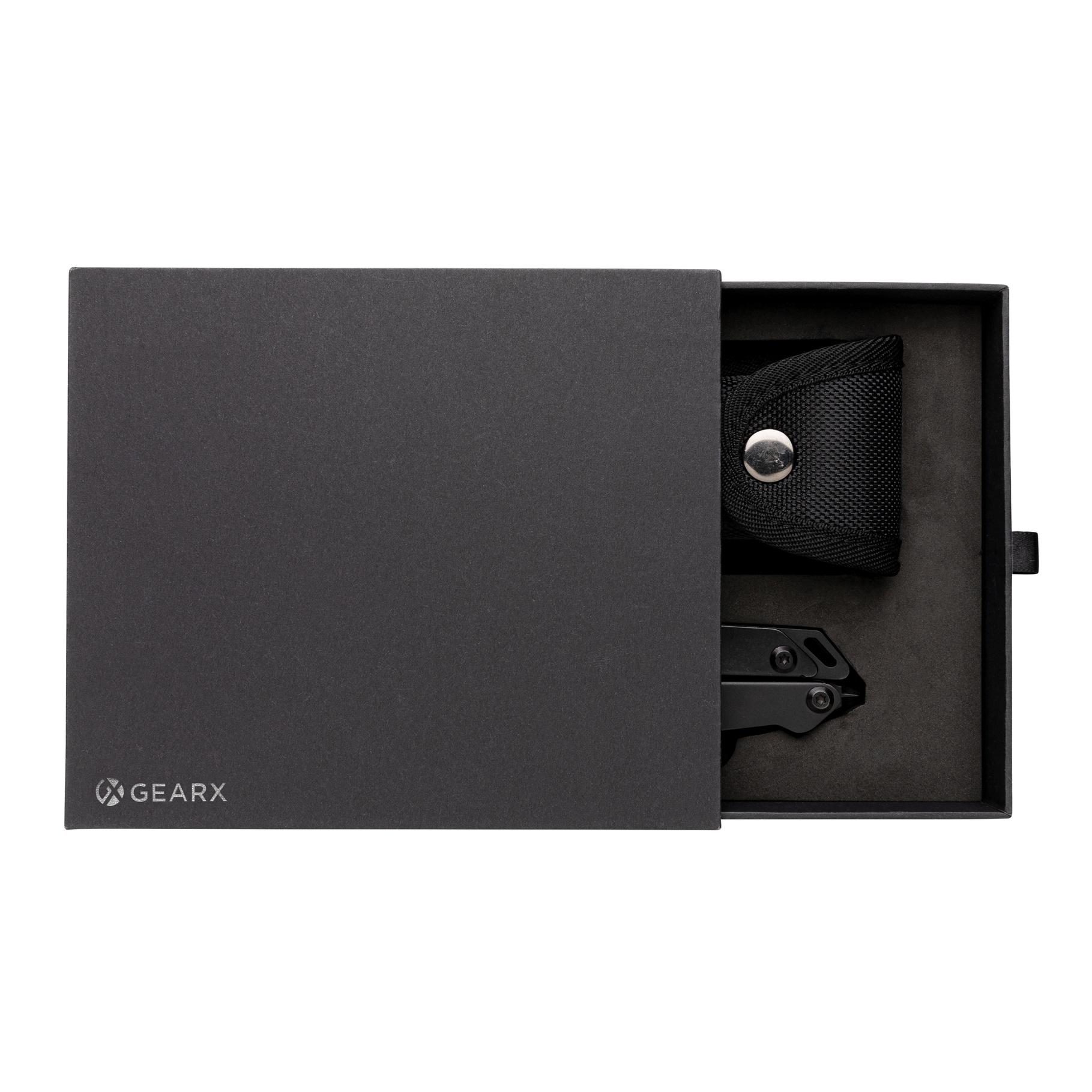 Pince polyvalente avec corps en aluminium et assorti d'outils en acier inoxydable 420, le tout entièrement noir. Les 13 fonctions sont: Couteau (avec cran d’arrêt), lime, scie, grand tournevis plat (avec cran d’arrêt), tournevis cruciforme, tournevis plat, pinces, pinces standard, coupe-fil, décapsuleur, tournevis, coupe-ceinture de sécurité, coupe-boîte. Emballé dans une boîte cadeau de luxe.