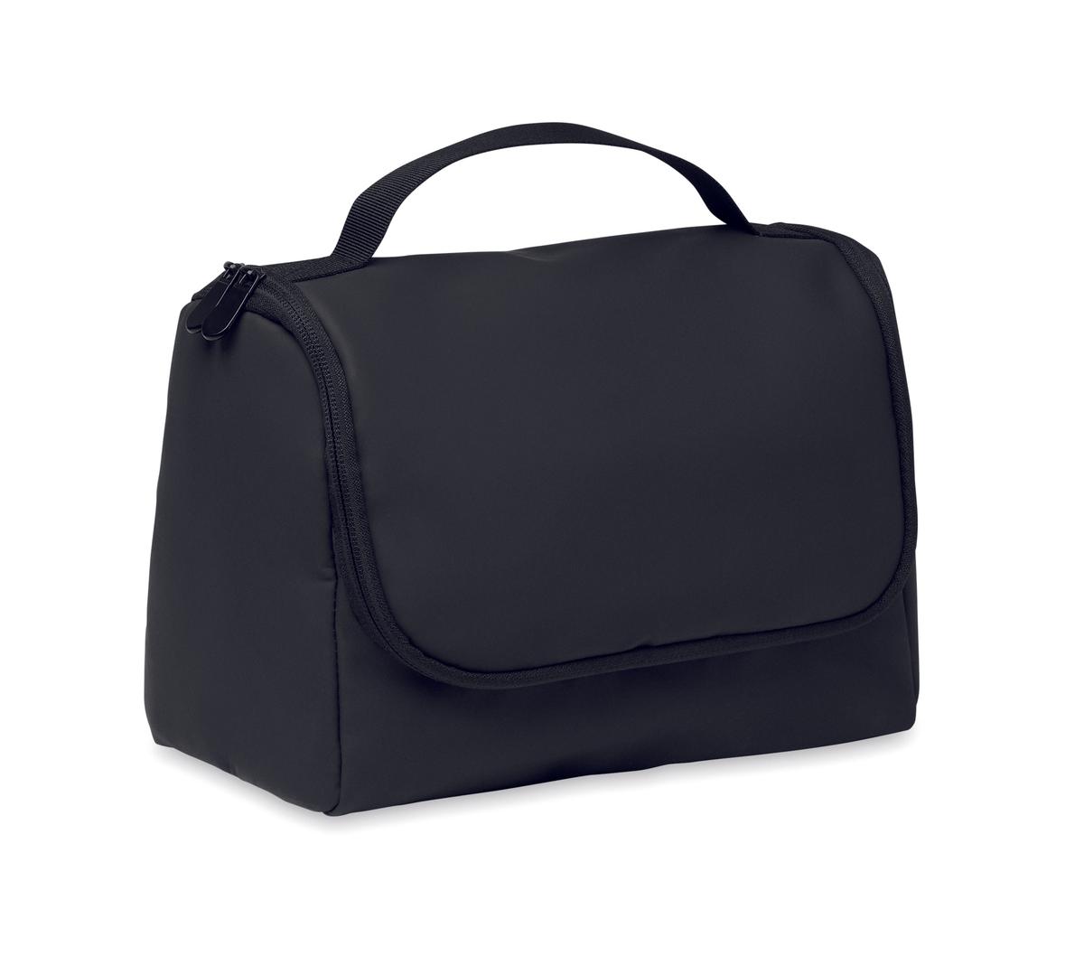 Sac à cosmétique en PU souple avec crochet de suspension et doublure en RPET 210D. Un grand compartiment principal avec un compartiment intérieur en filet zippé et un compartiment...