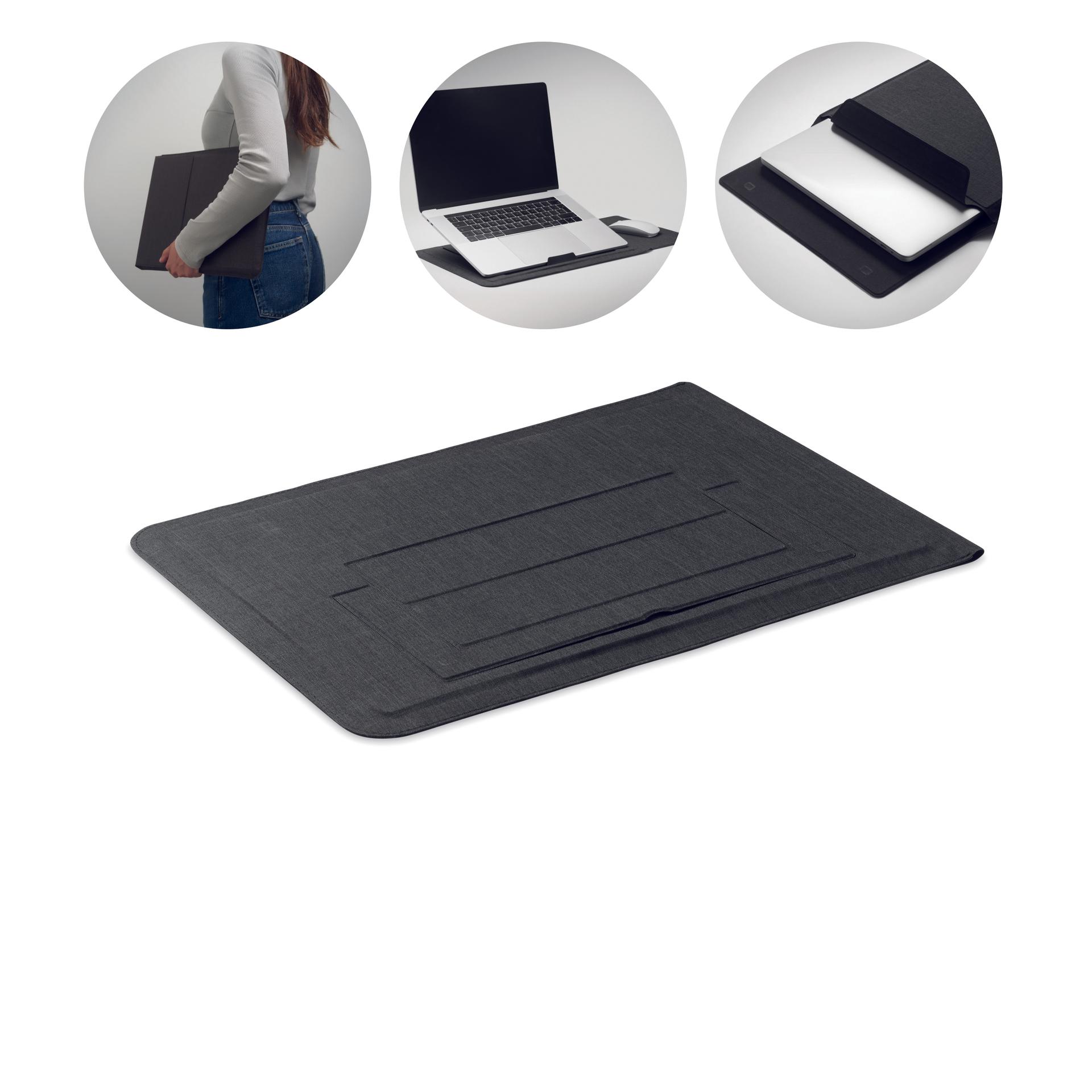 Pochette pour ordinateur portable RPET de 16 pouces avec support pour ordinateur portable et fonctionnalité de tapis de souris lorsqu'elle est dépliée.