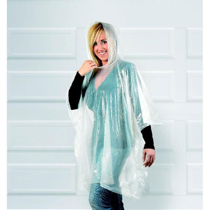 Poncho de pluie transparent en PE, présenté dans une coque en AS avec un mousqueton.