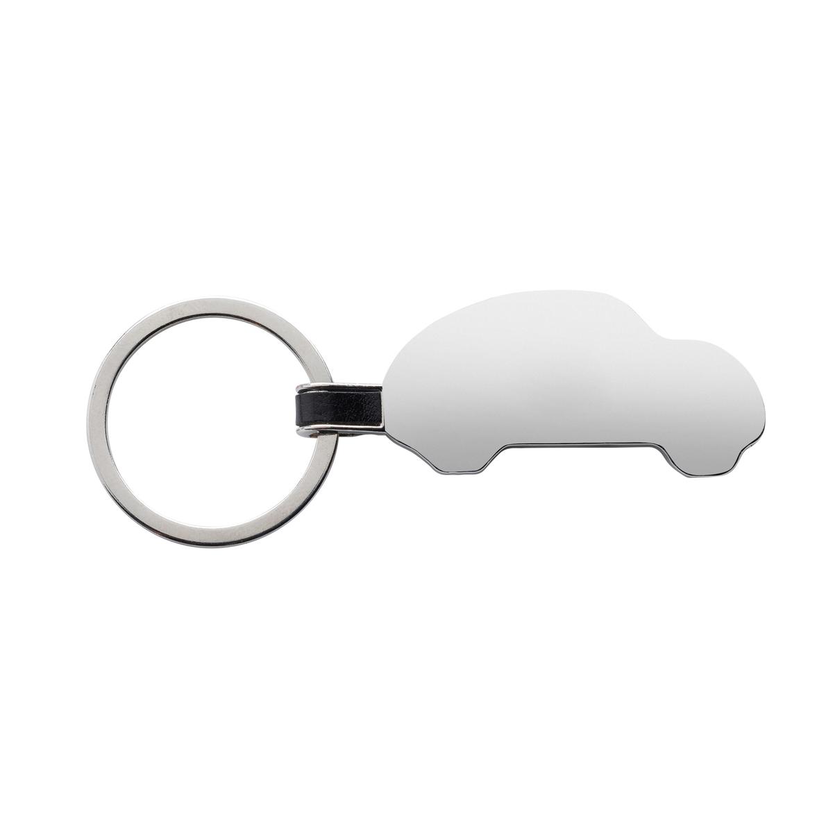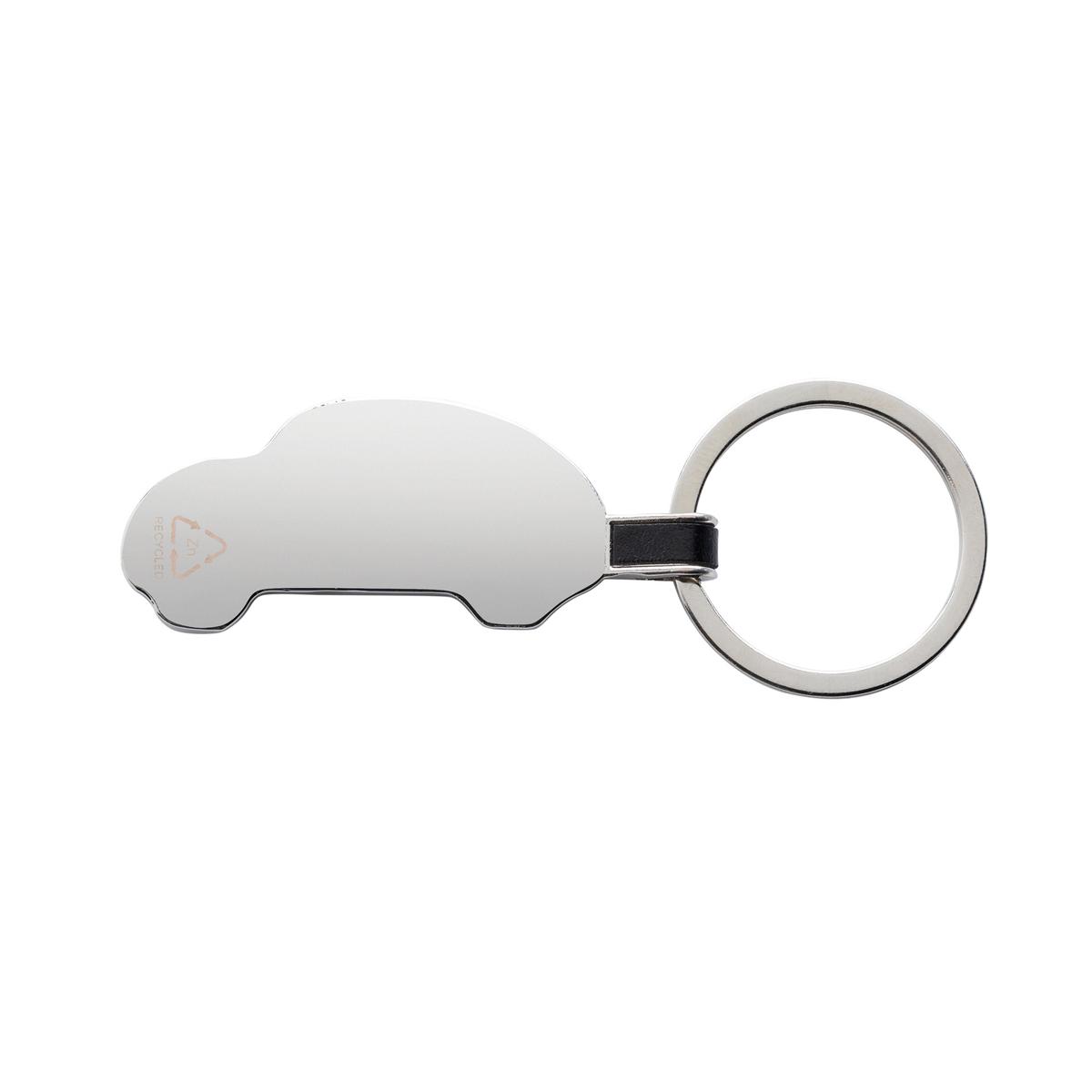 Porte-clés en forme de voiture en alliage de zinc recyclé RCS. Contenu total recyclé : 84% sur la base du poids total de l'article. La certification RCS garantit une chaîne d'approvisionnement entièrement certifiée des matériaux recyclés. Emballé dans un sachet en papier.