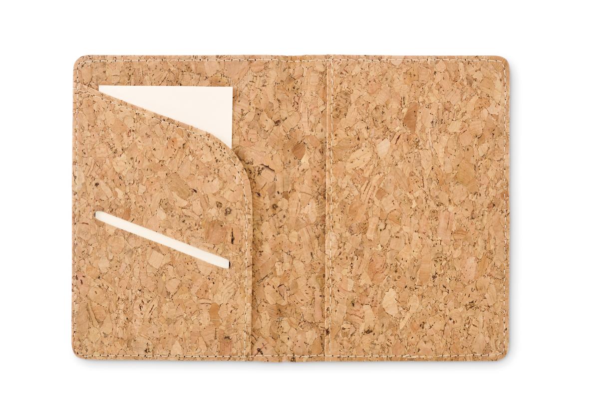 Porte-passeport en liège avec compartiment intérieur pour cartes.