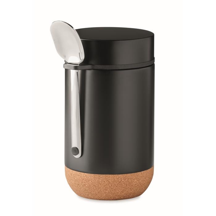 Pot de conservation isotherme en acier inoxydable à double paroi, avec un couvercle à vis et un détail de base en liège. Comprend une cuillère. Capacité : 400ml. Le liège est un matériau 100% naturel. En raison de sa structure et de la porosité de sa surface, le résultat final de l'impression par article peut présenter des différences.