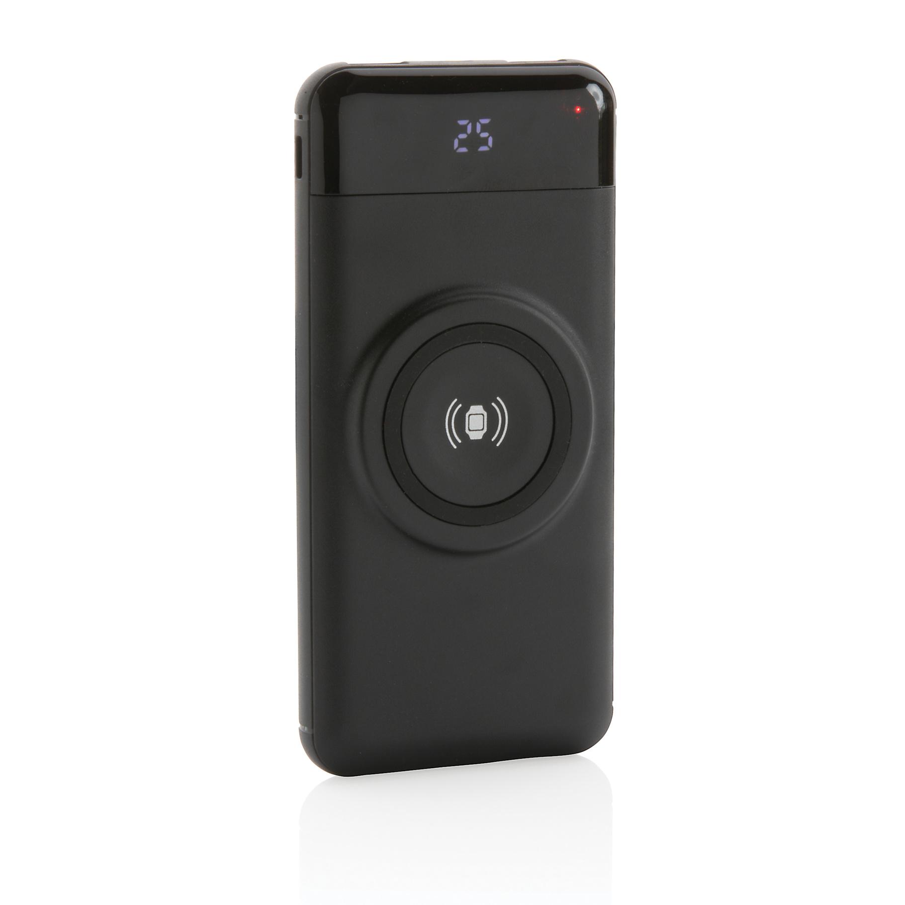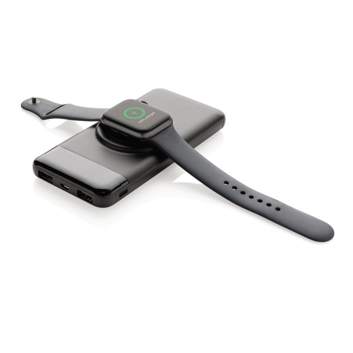 Powerbank multifonction de 10.000 mAh qui peut charger vos appareils mobiles sans fil et également votre Apple Watch via le chargeur sans fil 3W. Avec 2 ports de sortie USB pour les appareils ne supportant pas la charge sans fil.. Entrée 5V / 2A, entrée Type-C 5V / 2A, sortie USB: 5V / 1A. Sortie sans fil 5W 5V / 1A, sortie sans fil pour montre 3W (5V / 600 mAh)). Câble micro USB en TPE sans PVC inclus.