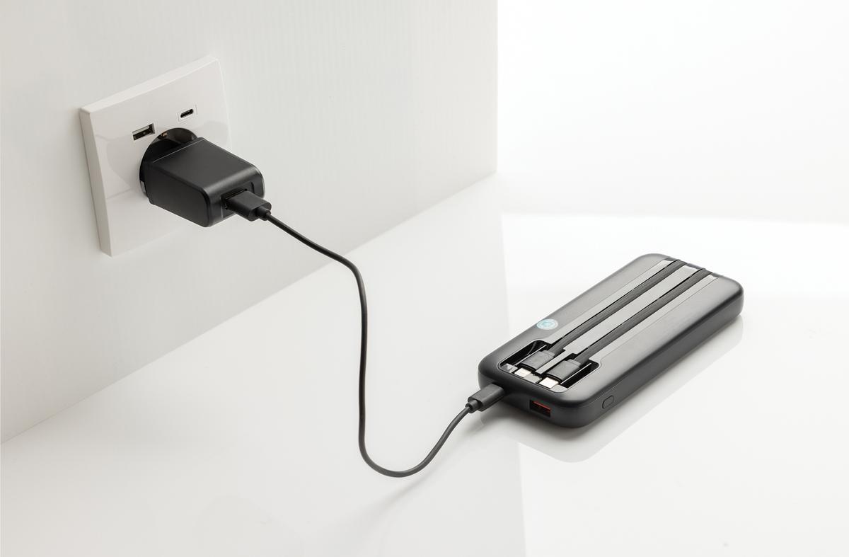 Batterie de secours à charge rapide tout-en-un avec câbles intégrés et écran d'affichage de la puissance. Le powerbank de 10 000 mah est livré avec un câble de type C et un câble Apple Lightning intégrés afin que vous puissiez facilement vous connecter à votre appareil pour commencer à charger rapidement votre appareil mobile. Un port supplémentaire de type C et un port USB A vous permettent de connecter votre propre câble de charge. Le powerbank contient une batterie lithium-polymère longue durée de grade A de 10.000 mAh. Fabriqué en ABS et TPE recyclés. Contenu recyclé total : 21 % sur la base du poids total de l'article. La certification RCS garantit une chaîne d'approvisionnement entièrement certifiée pour les matériaux recyclés. Emballé dans un emballage kraft FSC®. Sans PVC. Sortie USB-A 5V⎓3,0A, 9V⎓2A, 12V⎓1,5A ; Sortie USB-C 5V⎓3,0A, 9V⎓2,22A, 12V⎓1,67 ; Entrée Type-C 5V⎓3,0A, 9V⎓2A, 12V⎓1,5A ; Câble USB-C intégré Sortie : 5V⎓3A 9V⎓2A 12V⎓ 1,5A ;