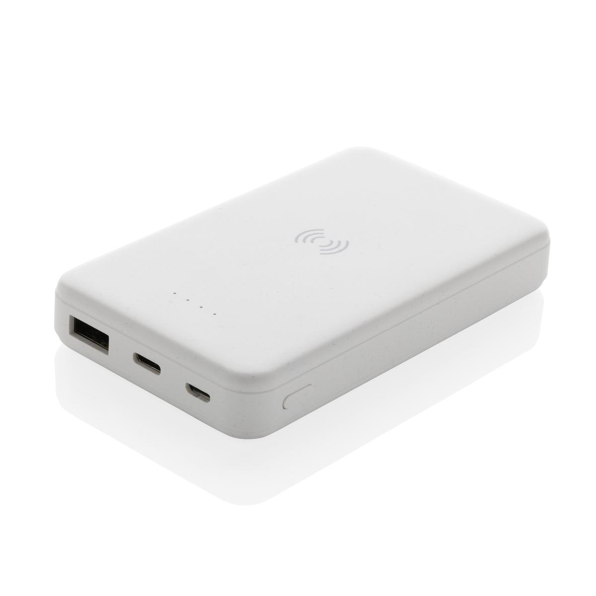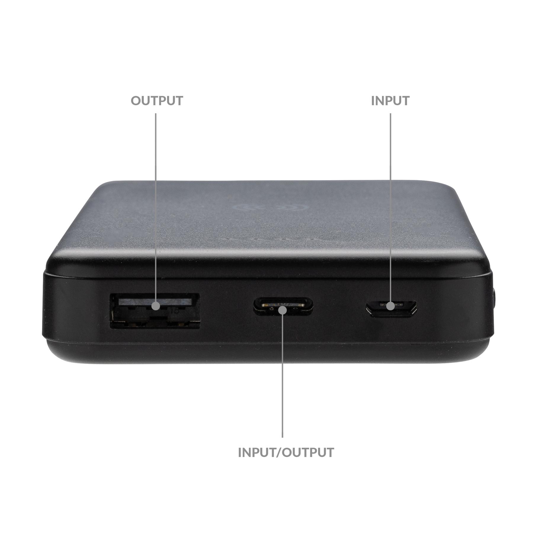 Batterie de secours 5000 mAh avec chargeur sans fil de 5W. Le boîtier est fabriqué en plastique ABS recyclé certifié RCS. Le RCS (Recycled Claim Standard) est une norme qui permet de vérifier le contenu recyclé d'un produit tout au long de la chaîne d'approvisionnement. Contenu recyclé total : 26 % sur la base du poids total de l'article. Lorsqu'il est complètement chargé, le powerbank vous fournit suffisamment d'énergie pour recharger votre téléphone portable jusqu'à deux fois (selon le modèle). Le powerbank contient une batterie lithium-polymère haute densité de classe A de 5000 mAh à longue durée de vie. Les indicateurs de puissance indiquent le niveau d'énergie restant pour que vous sachiez toujours quand recharger. Entrée Micro USB 5V/2A ; Entrée Type-C 5V/2.4A ; Sortie USB 5V/2.4A, Sortie Type C:5V/2A Article et accessoires sans PVC. Câble de chargement en TPE recyclé certifié RCS inclus. Livré dans un emballage FSC® mix.