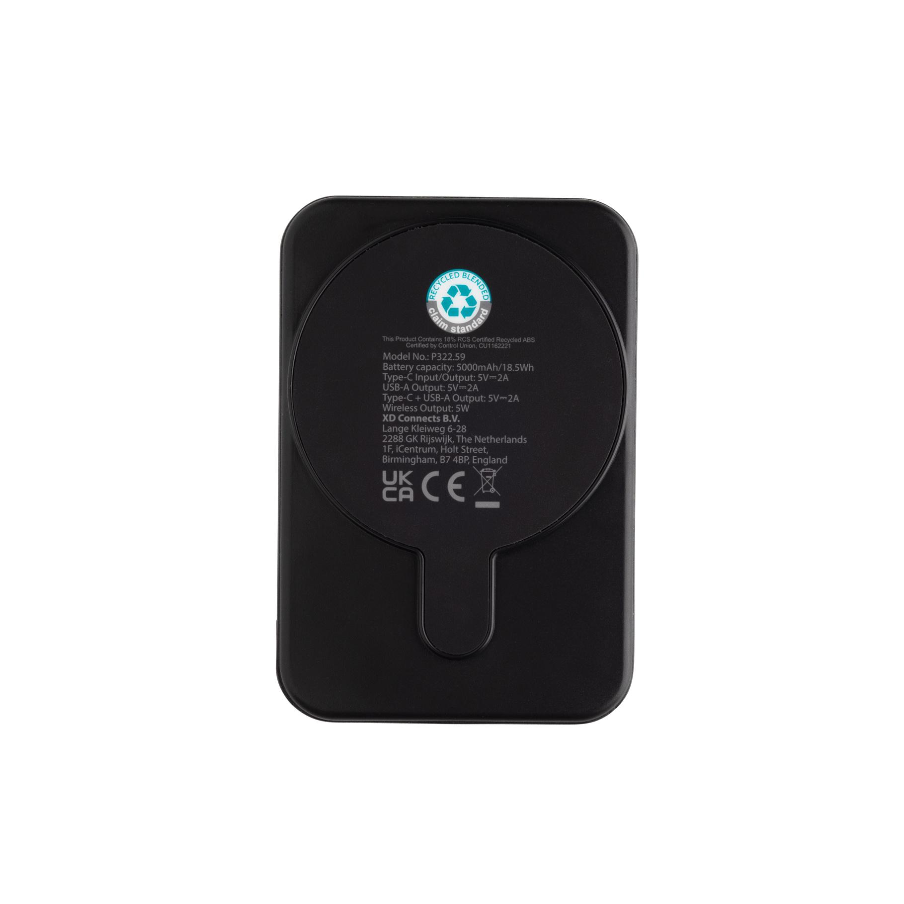 Batterie de secours de poche 5000mAh avec chargeur magnétique sans fil de 5W, dont le boîtier est fabriqué en plastique ABS recyclé certifié RCS. Le RCS (Recycled Claim Standard) est une norme qui permet de vérifier le contenu recyclé d'un produit tout au long de la chaîne d'approvisionnement. Contenu recyclé total : 20 % sur la base du poids total de l'article. Avec option de sortie USB A et UCB C. Le powerbank contient une batterie lithium-polymère longue durée de classe A de 5 000 mAh. Les indicateurs de puissance indiquent le niveau d'énergie restant afin que vous sachiez toujours quand recharger. ; Entrée Type-C 5V/2,4A ; Sortie USB C /USB A:5V/2A.4A L'article et les accessoires sont exempts de PVC. Câble de recharge en TPE recyclé certifié RCS inclus. Emballé dans un emballage FSC® mix.
