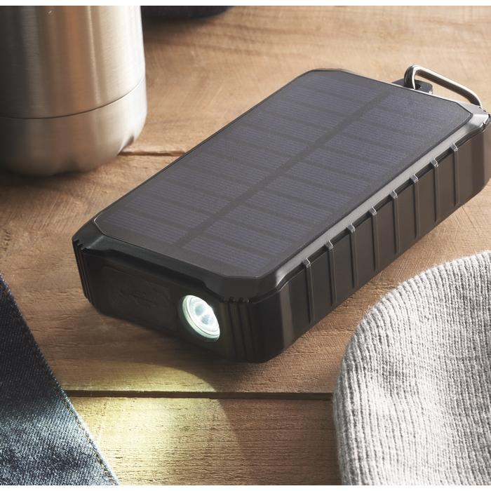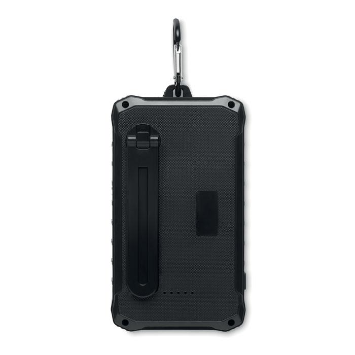 Powerbank solaire 8000 mAh avec dynamo à manivelle. Comprend 1 lampe LED de 100 lumens. Entrée/sortie de type C, 2 sorties USB-A. Courant de sortie DC 5V/2.1A.