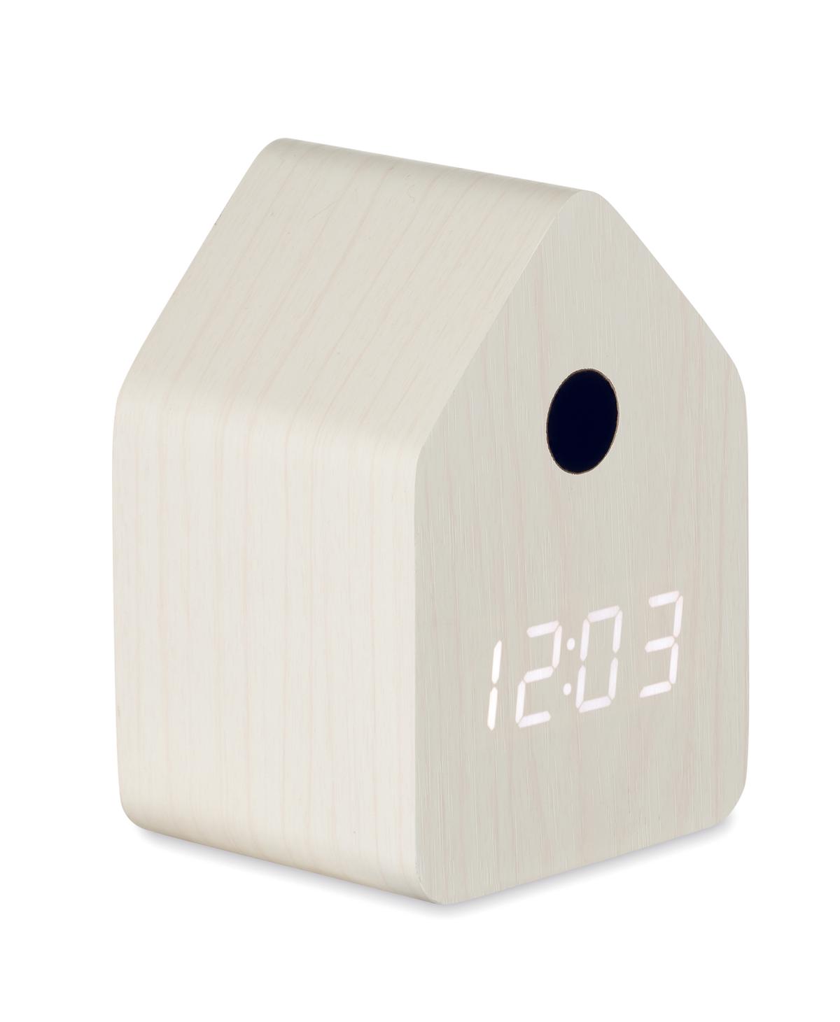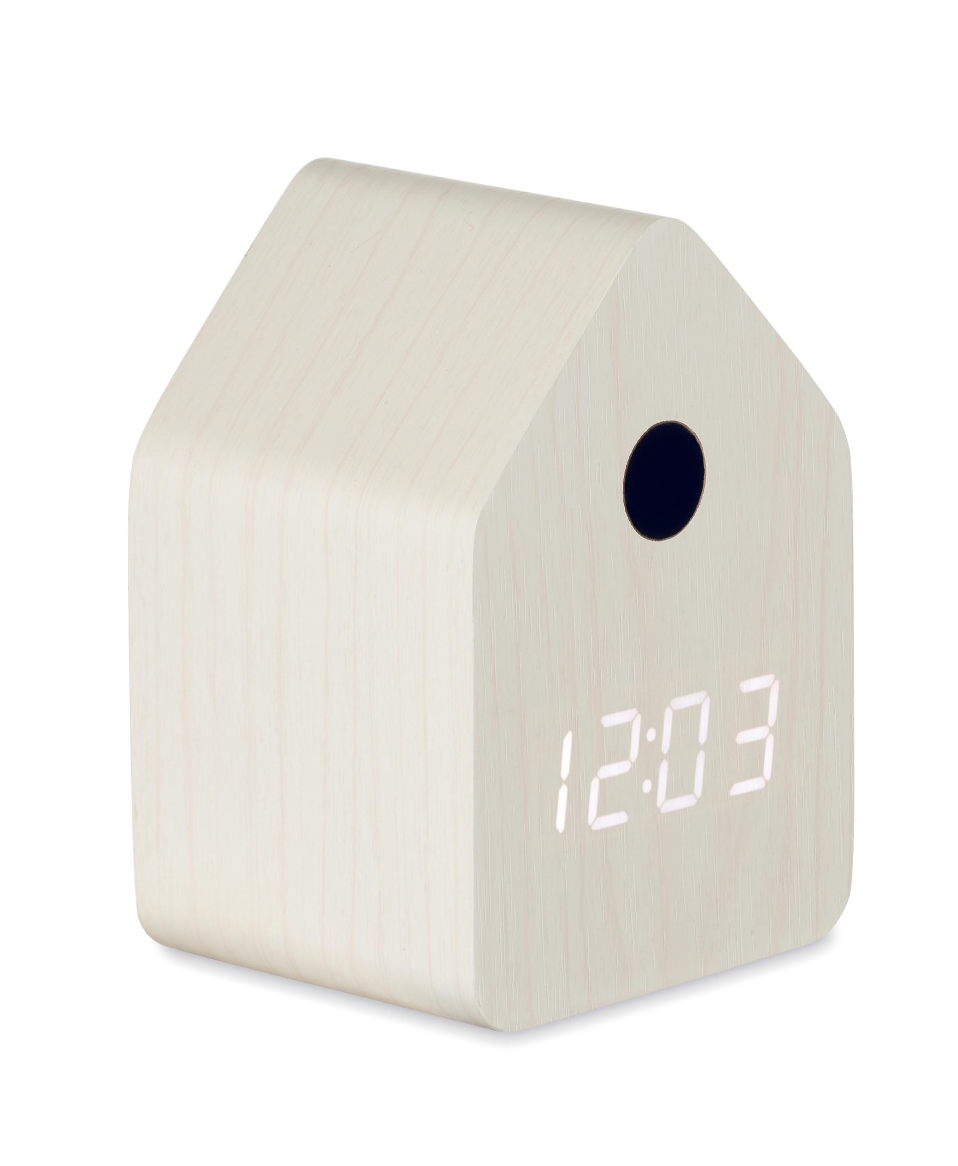 Horloge de bureau en MDF comprenant une alarme intégrée avec chant de coucou et affichage de température. L'oiseau chantera à chaque nouvelle heure et à l'horaire de l'alarme. Affichage LED blanc. Mode silence de 22.00h et 06.00h. Intervalles de répétition de 5 minutes