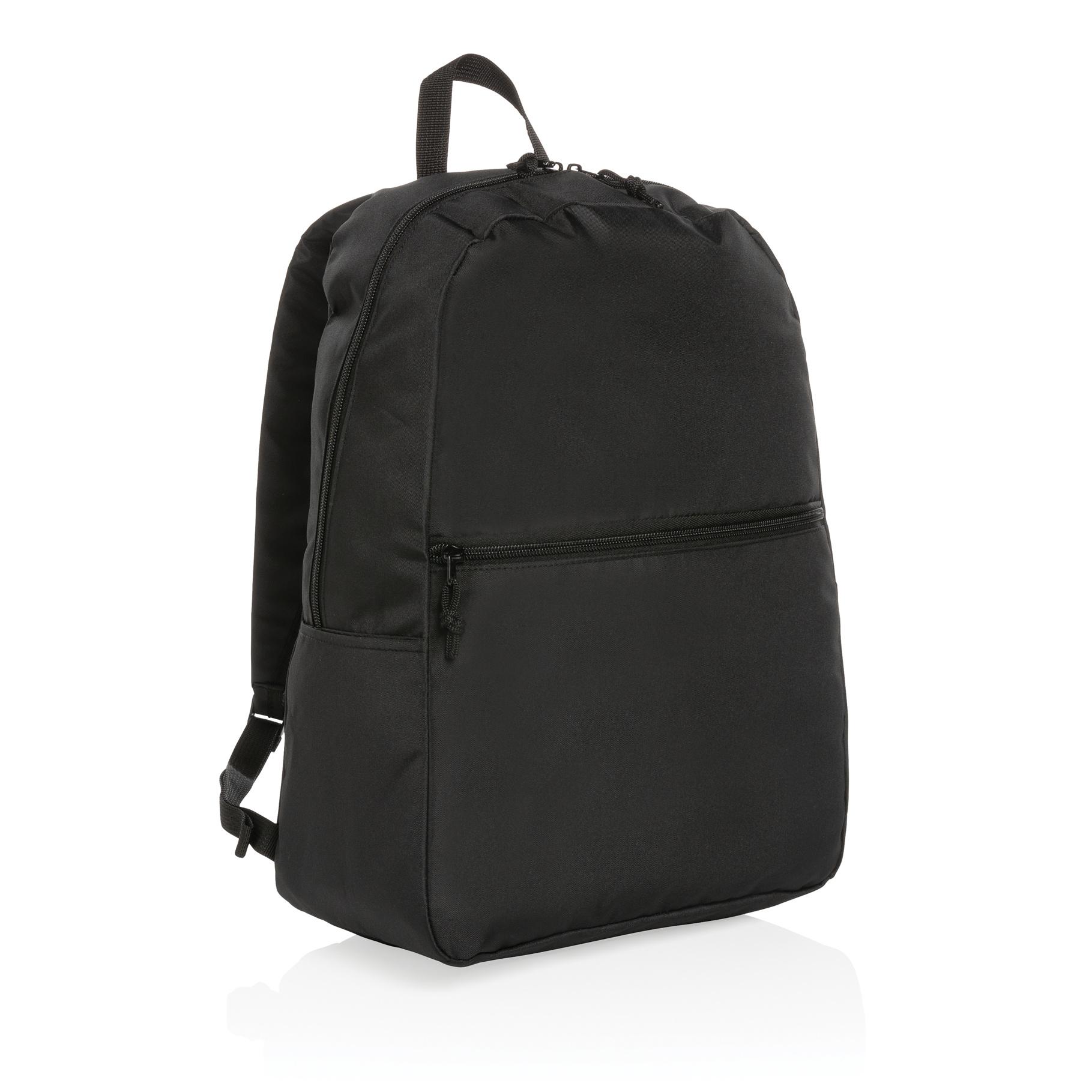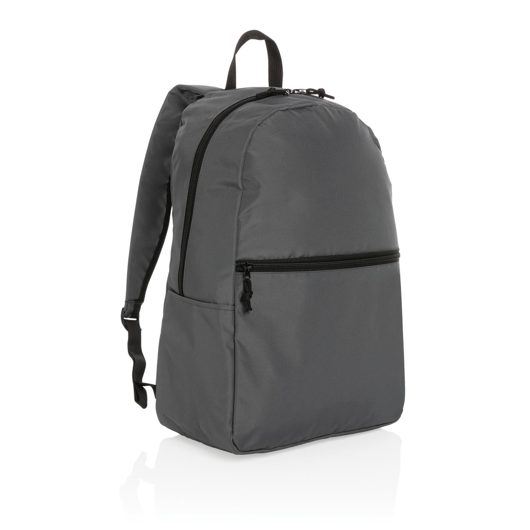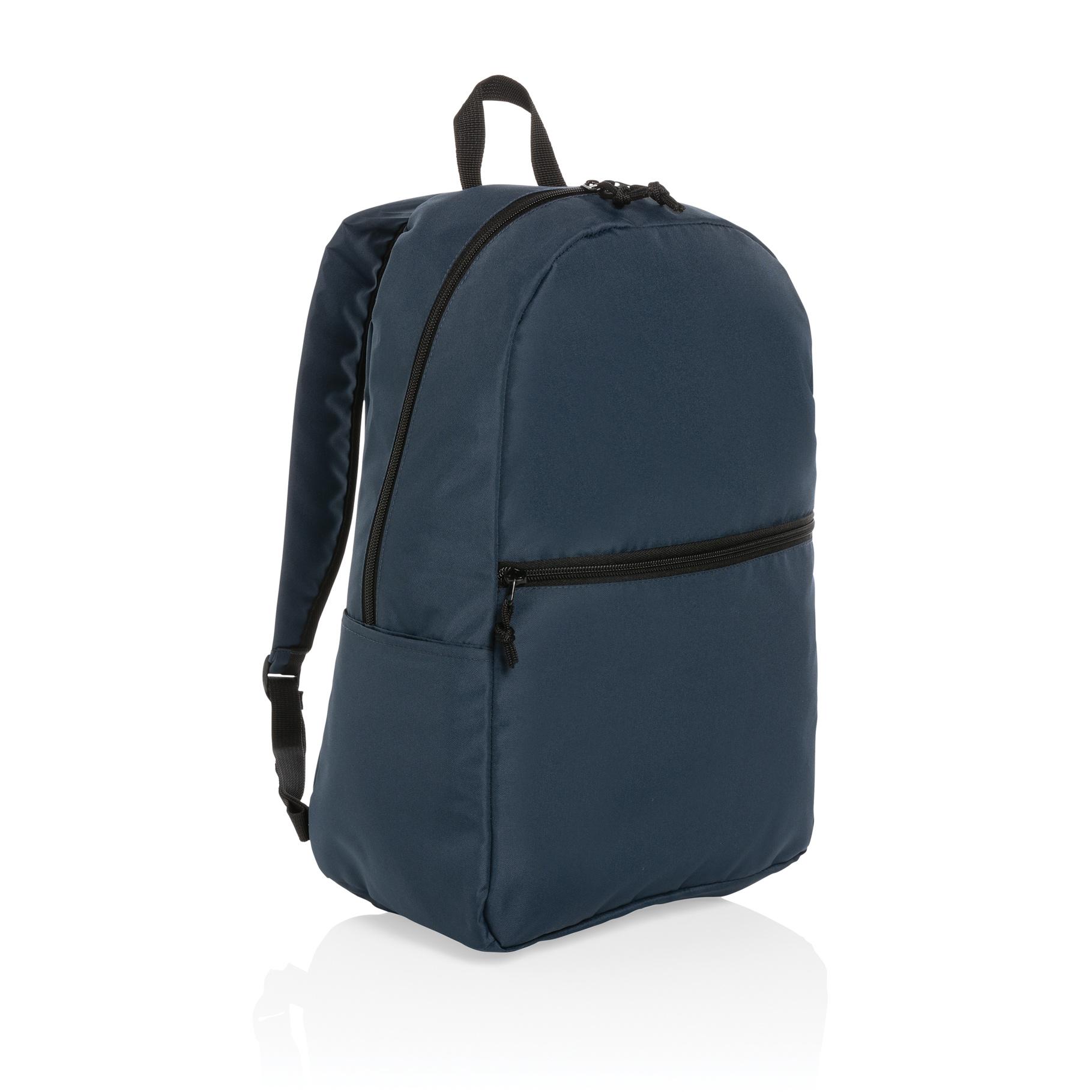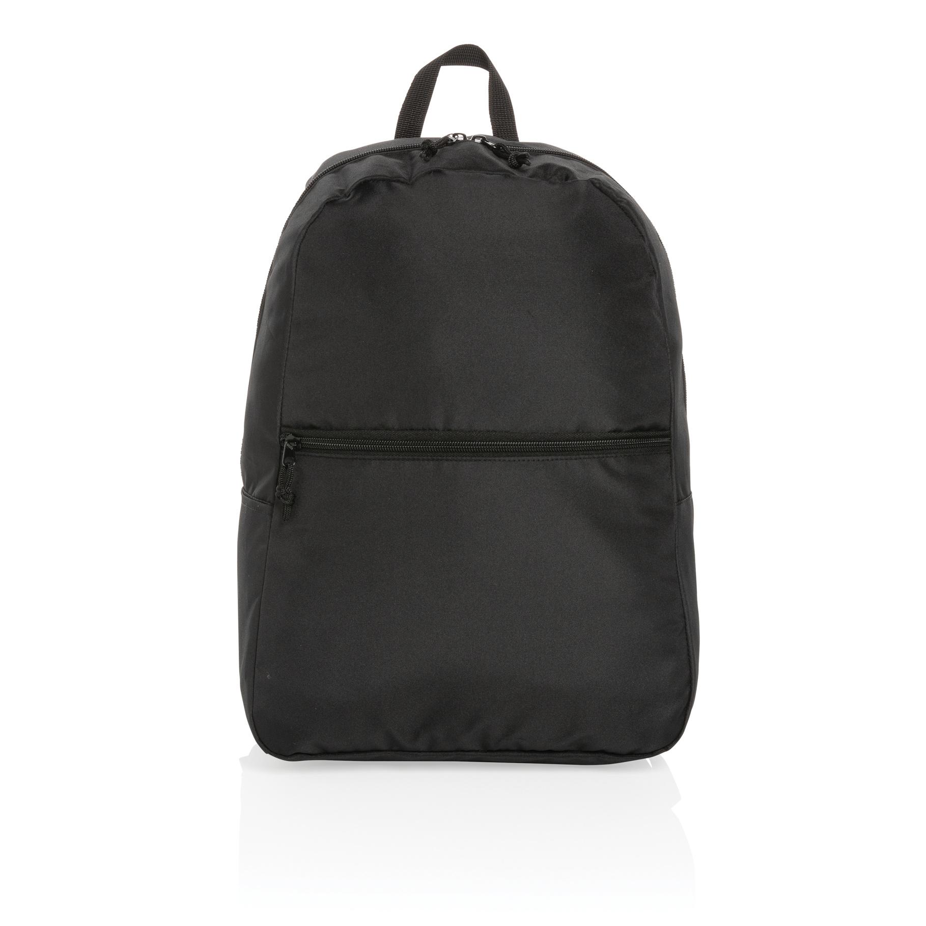 Sac à dos en 300D rPET. Poche avant zippée. Ce sac à dos a réutilisé 11,5 bouteilles PET de 500 ml et économisé 6,85 litres d'eau.