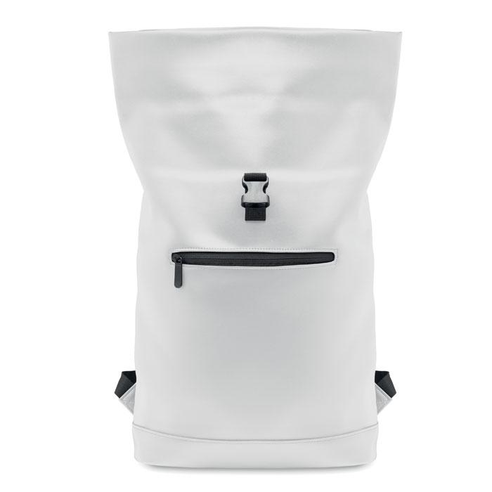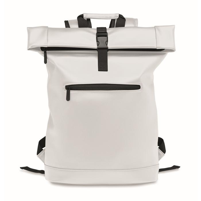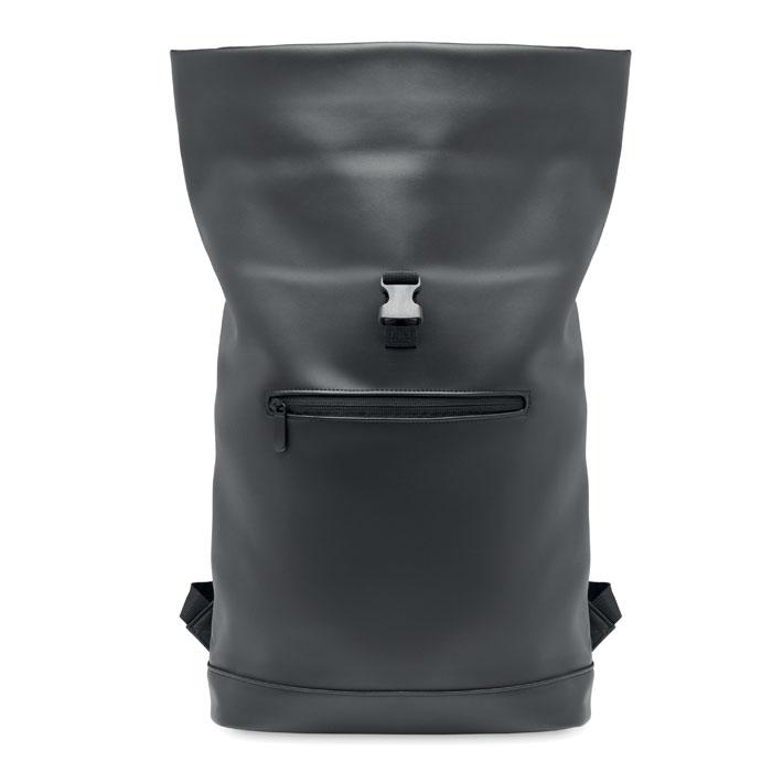 Sac à dos pour ordinateur portable 15 pouces en PU souple avec dos rembourré et base renforcée. Grande poche frontale zippée. La doublure est en RPET 210D.