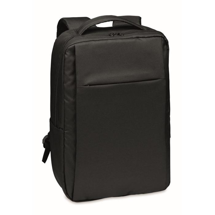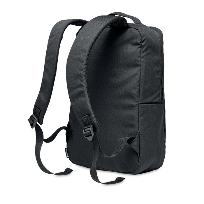 Sac à dos pour ordinateur en polyester RPET 300D avec bandoulière rembourrée comprenant un compartiment interne principal pour un ordinateur portable de 16 pouces et un câble de chargement USB.
