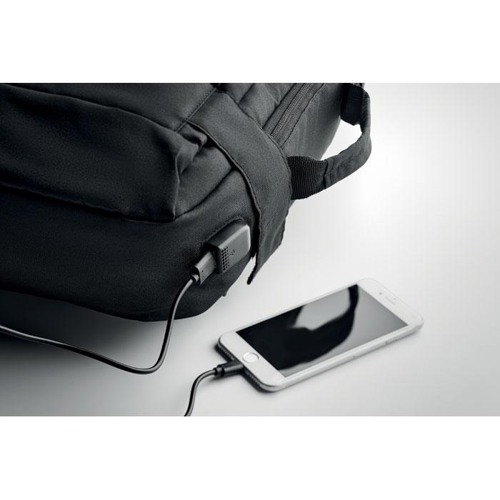 Sac à dos pour ordinateur en polyester RPET 300D avec bandoulière rembourrée comprenant un compartiment interne principal pour un ordinateur portable de 16 pouces et un câble de chargement USB.
