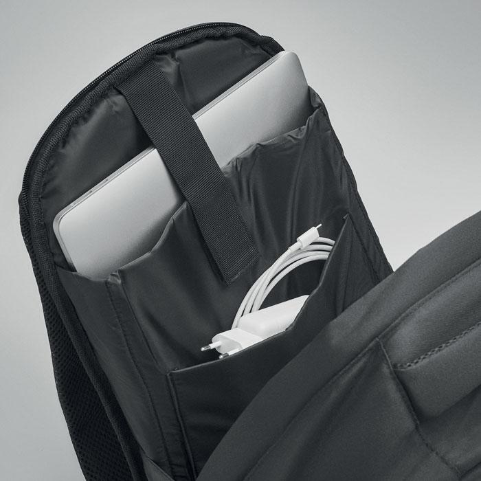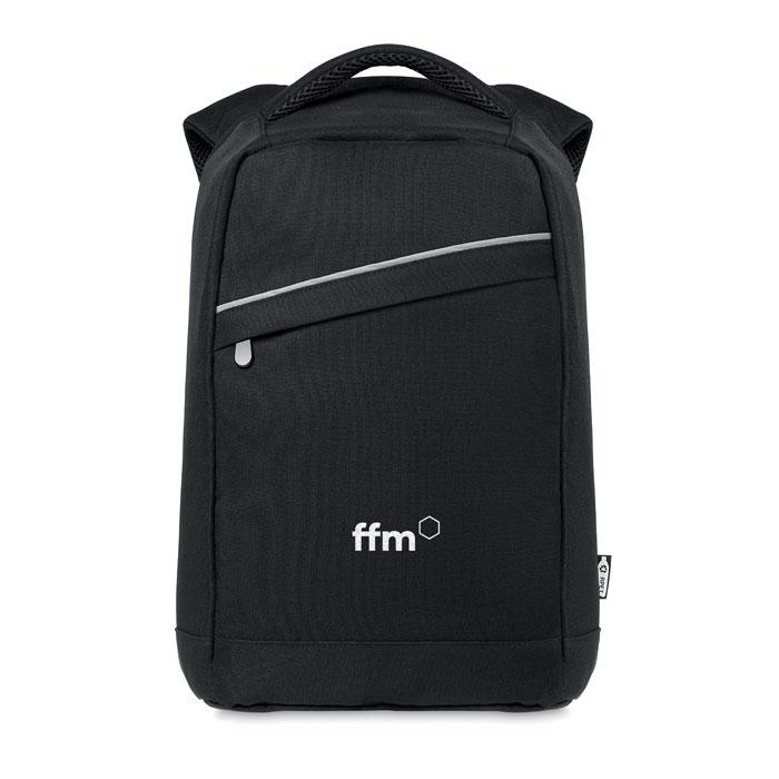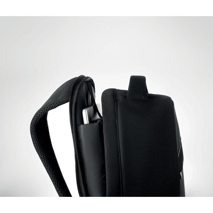 Sac à dos en RPET 600D avec bandoulière et dos rembourrés. Comprend un compartiment interne rembourré pour ordinateur portable de 13''. Fermeture éclair au dos pour plus de sécurité.