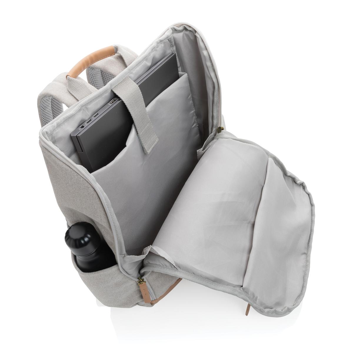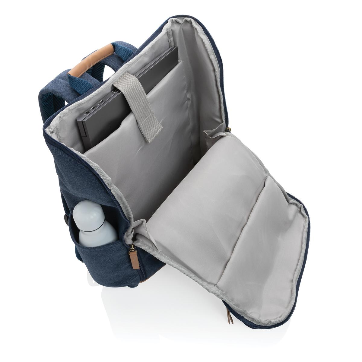 Sac à dos ordinateur en toile composé de 60% coton recyclé et 40% polyester recyclé avec doublure en polyester recyclé 150D. Avec poche frontale verticale profonde et une fermeture à zip qui révèle un intérieur spacieux avec un compartiment pour ordinateur portable 15". Le traceur AWARE™ qui prouve l'utilisation authentique de la toile recyclée. 2% de chaque vente de produit Impact vendu sera versée en don à Water.org.