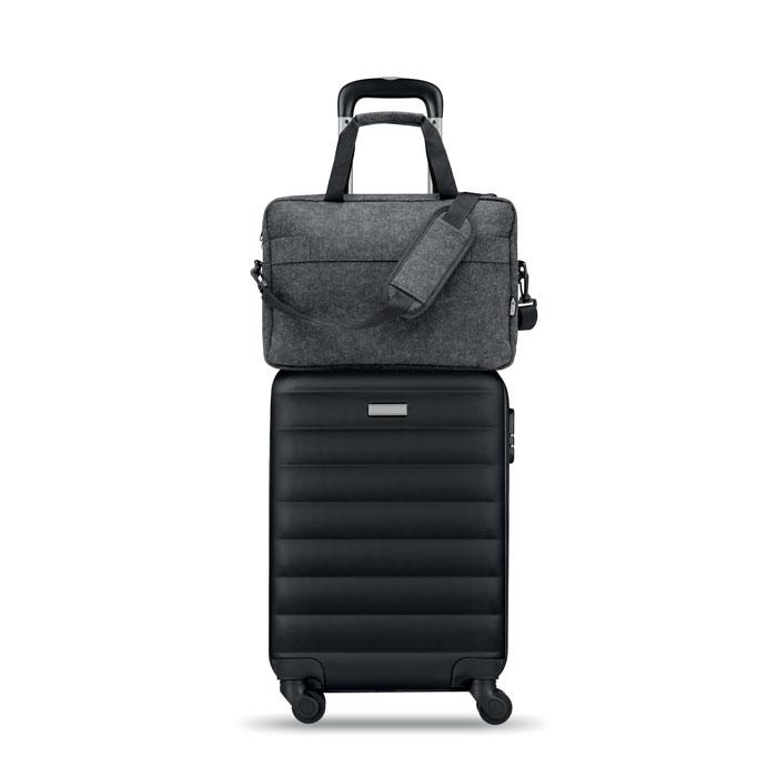Sac à dos pour ordinateur portable de 15 pouces en feutre RPET comprenant un compartiment interne principal et une poche frontale zippée. Bandoulière détachable et réglable. Passant pour trolley au verso.