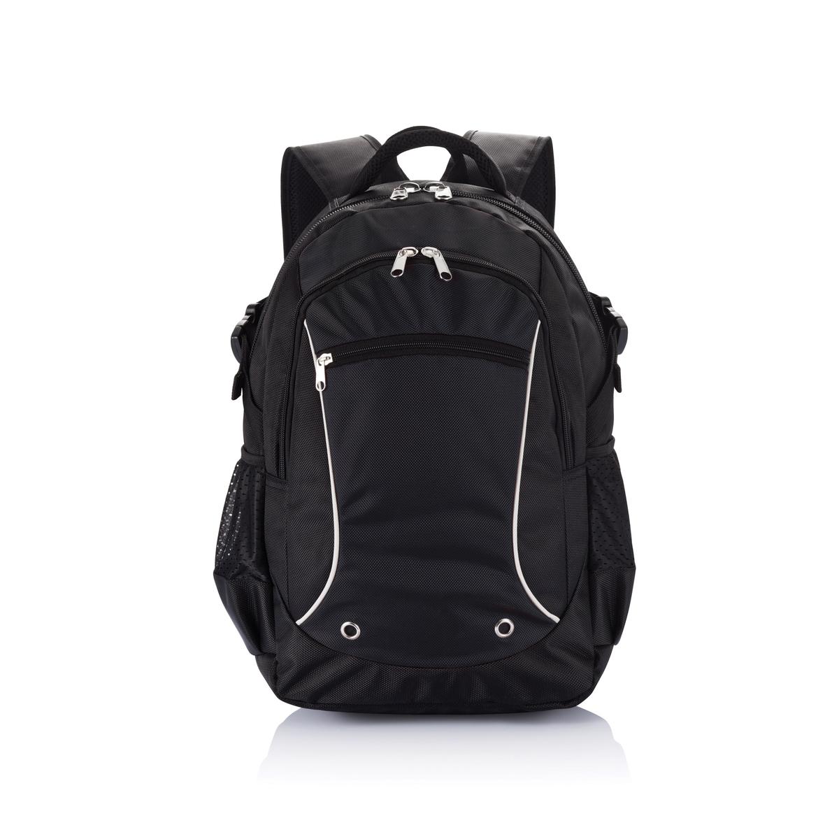 Sac à dos 1680D et jacquard. Poche frontale zippée avec fonction organiseur. Compartiment principal avec poche rembourrée pour ordinateur portable 15,6”. Détails réfléchissants. Pochettes en maille sur les cotés. Sans PVC.
