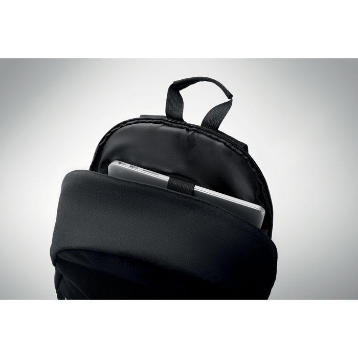 Sac à dos pour ordinateur portable de 15 pouces en coton recyclé de pré consommation et en polyester recyclé (70 %/30 %). Il est doté d'une poche frontale zippée et d'une poche arrière zippée. Dos et bretelles rembourrés. Porte-trolley au verso.