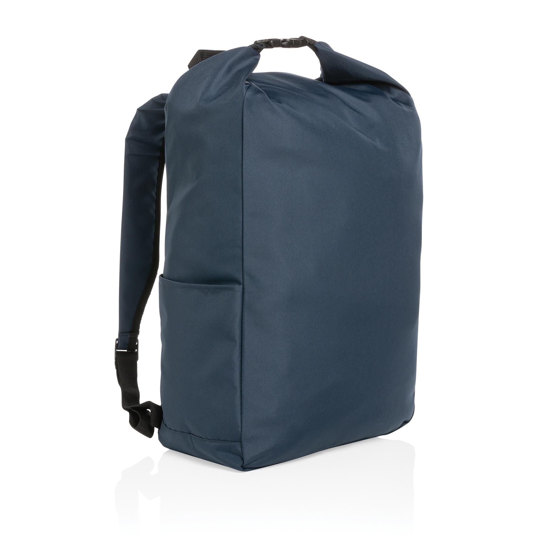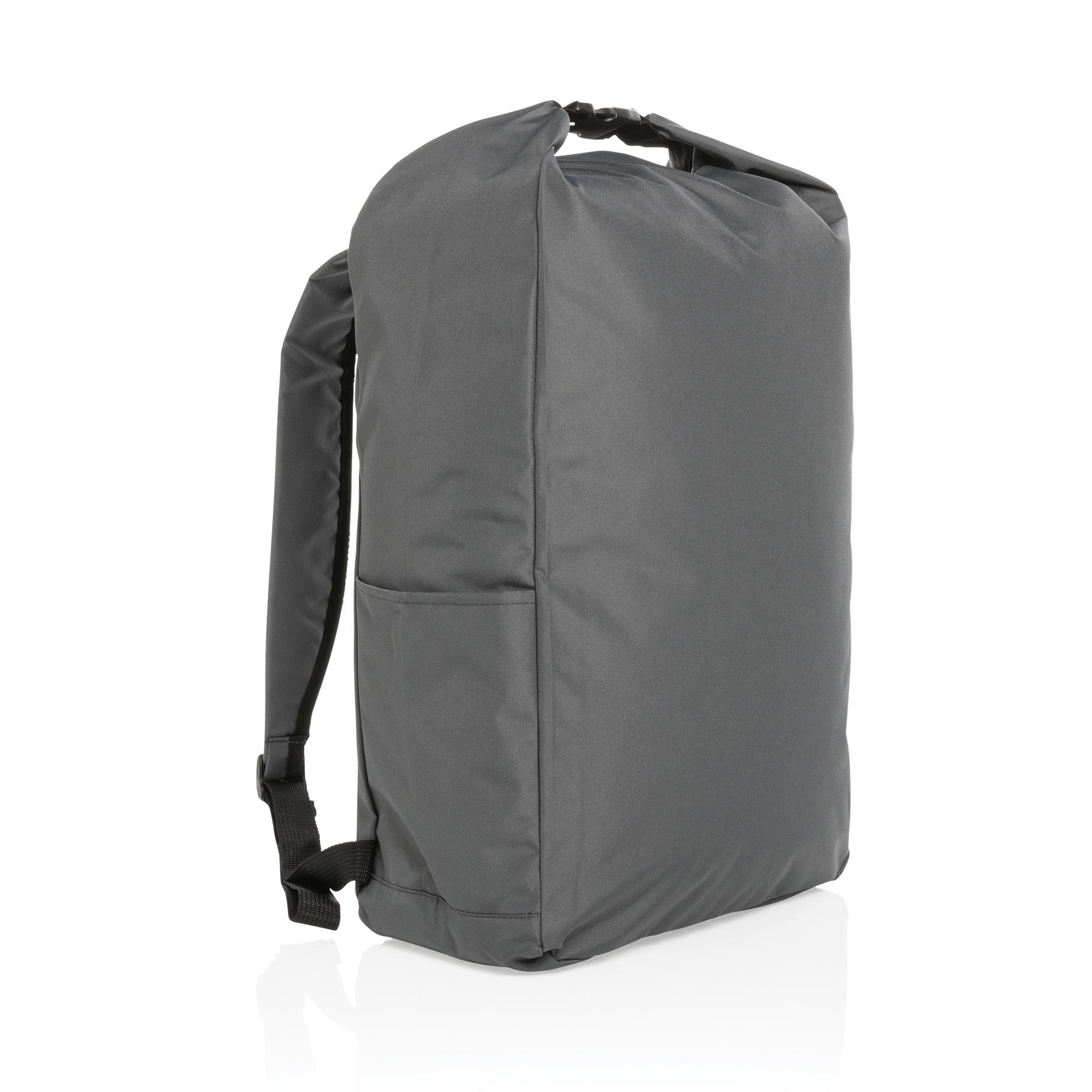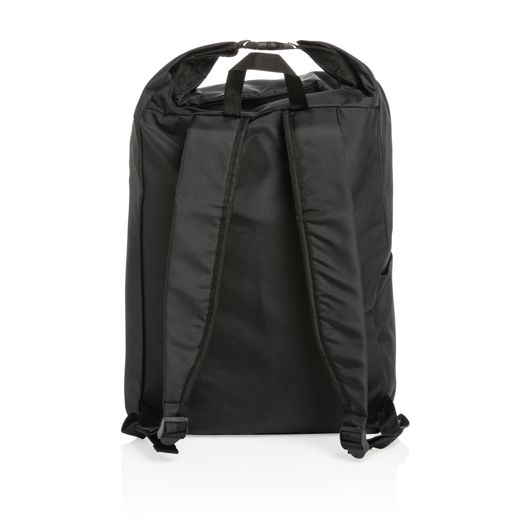 Sac à dos rolltop en 300D rPET. Ce sac à dos a réutilisé 11,6 bouteilles PET de 500 ml et économisé 6,92 litres d'eau.