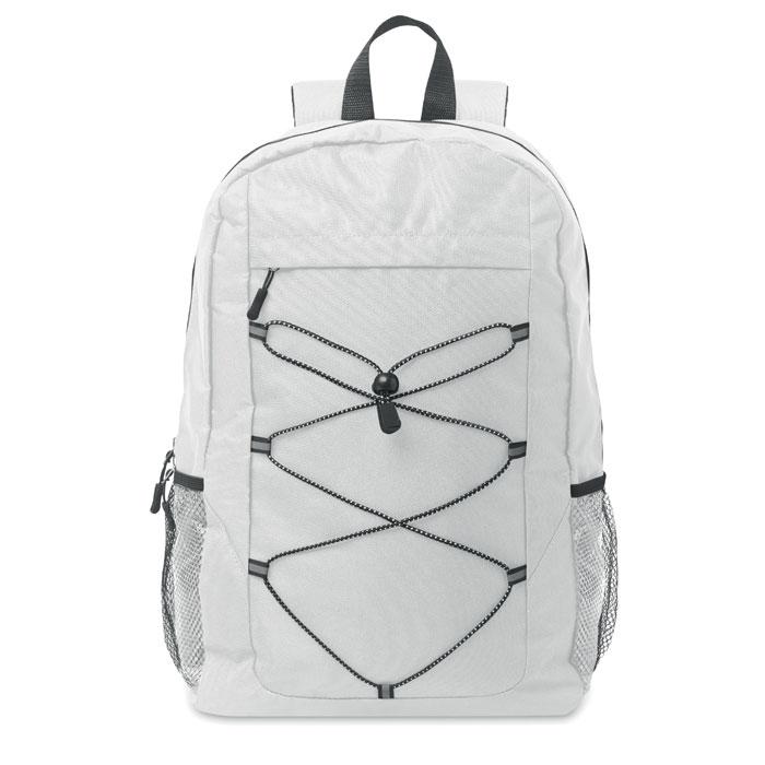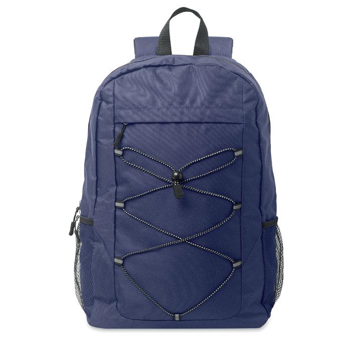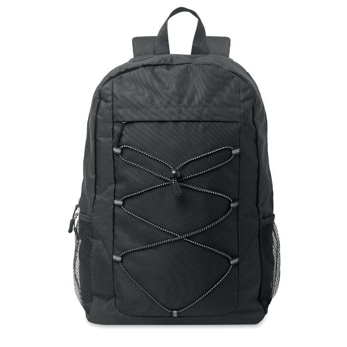 Sac à dos en polyester 600D RPET avec cordon et poche frontale zippée. Poches en filet sur les deux côtés.