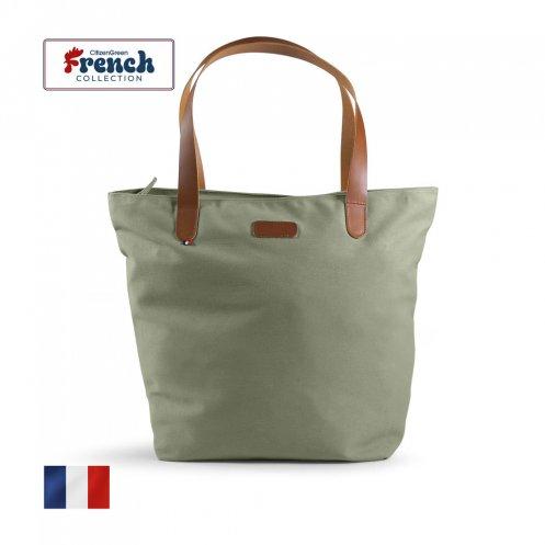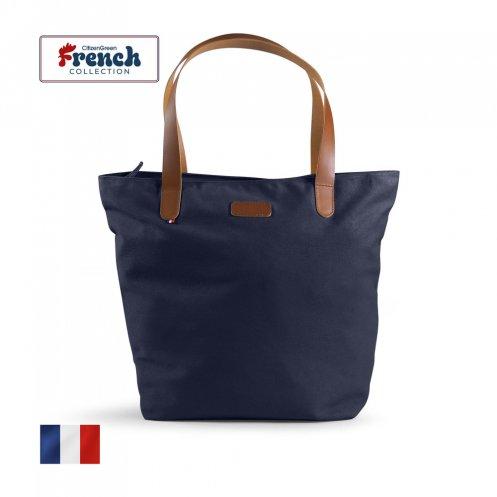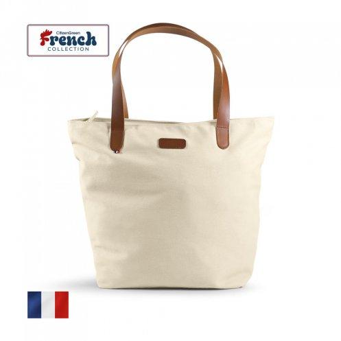 Sac cabas coupé et cousu en France, fermeture zippée, mousqueton porte-clés intérieur (cuir) et 2 poignées longues 3,5 x 70 cm