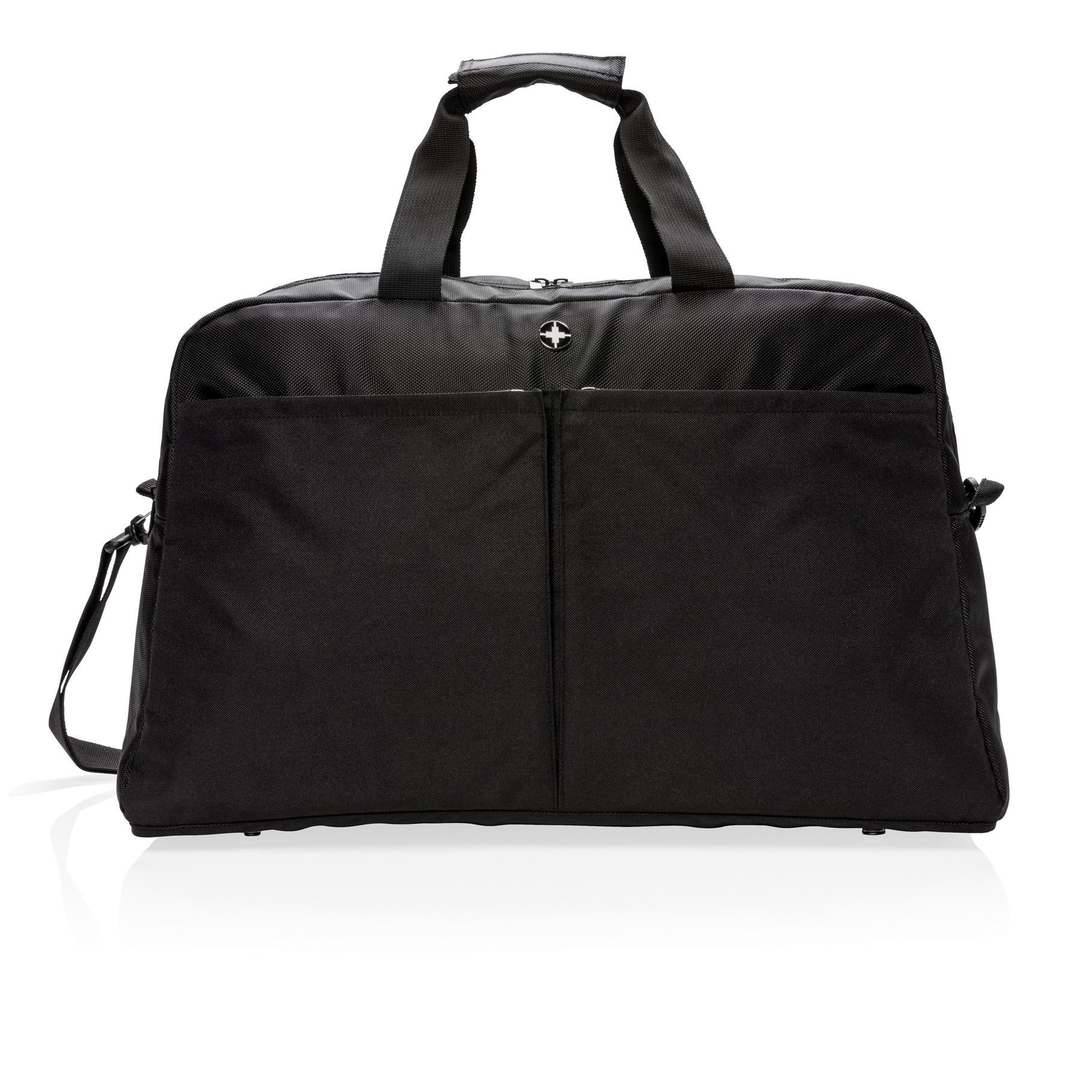 Sac révolutionnaire 1680D et 600D combine les avantages de deux genres : la portabilité et l'organisation d’un sac de sports et le mode d’ouverture d’une valise. Fermeture à zip pour ouvrir le sac en 2 et accéder aux différents compartiments. Avec un compartiment pour ordinateur portable 15,6". À l’arrière, une pochette à magazines et une poche zippée facile d'accès avec protection RFID. À l’avant, 2 grandes poches zippées faciles d’accès. Sans PVC.