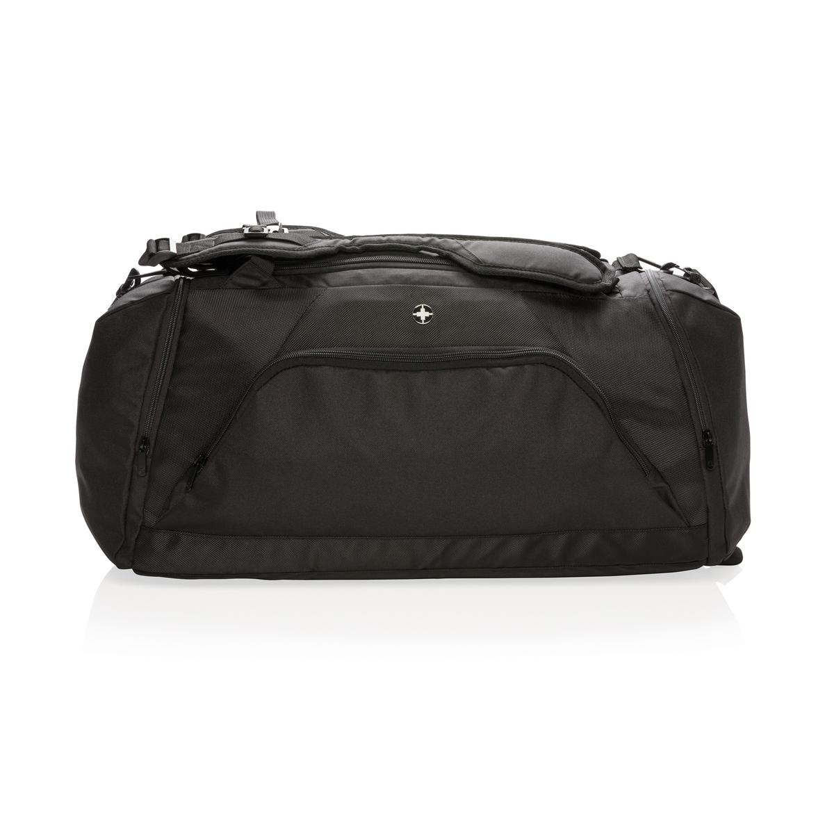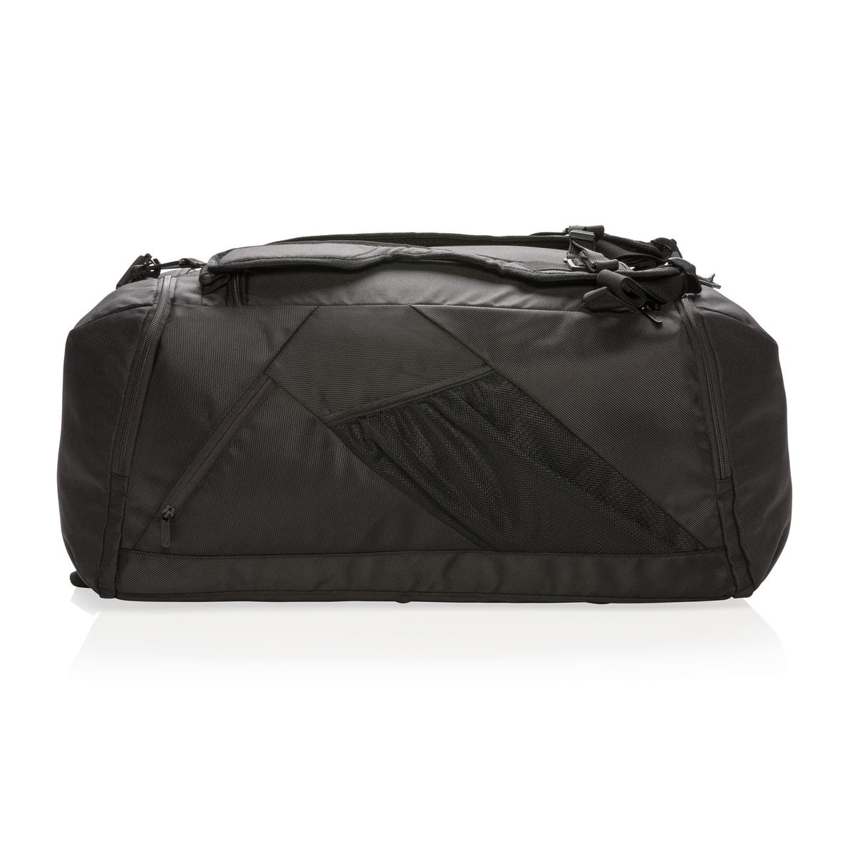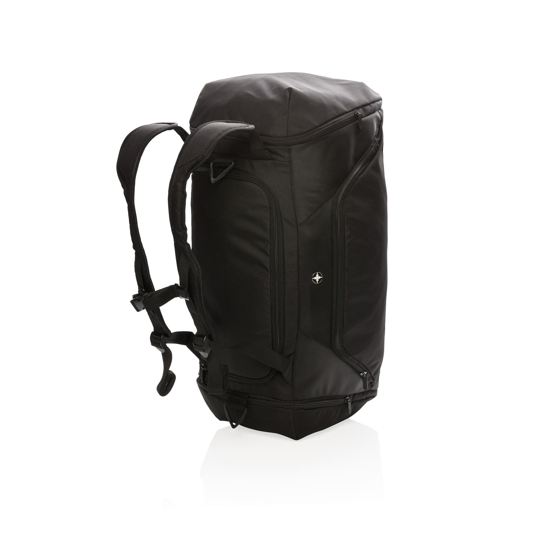 Sac 2-en-1 1680D et 600D ultraléger, convertible en sac à dos ou sac de sports. Compartiment principal spacieux et zippé en forme de U, ouverture sur le côté pour un compartiment à chaussures ou vêtements sales et poche latérale zippée. Au dos, poche porte-bouteille et poche à accès facile. Poche frontale zippée avec deux compartiments avec protection RFID. Bretelles ajustables pour plus de confort. Sans PVC.