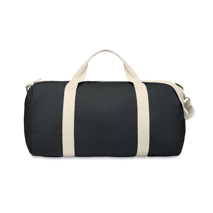 Sac de sport en tissus recyclés (60% coton recyclé, 40% polyester recyclé) en 320 gr/m² avec poignée en sangle de coton naturel et une bandoulière réglable et amovible.