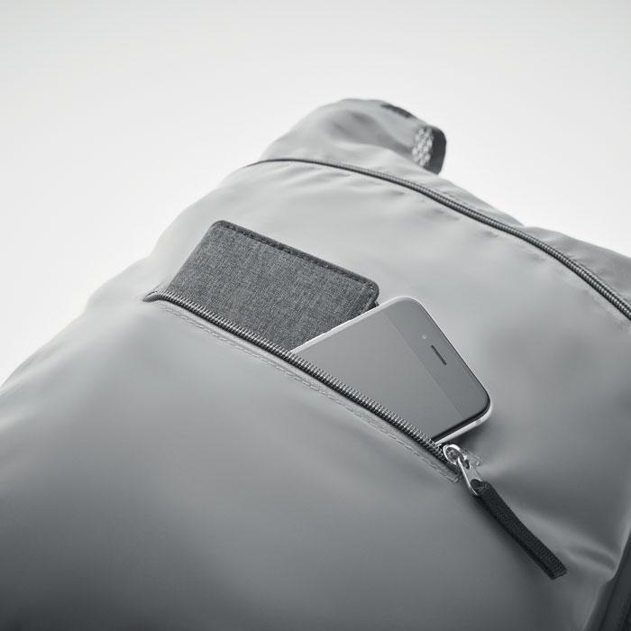 Sac à dos de sport pliable en polyester 190T réfléchissant avec poche frontale zippée. Bretelles réglables.