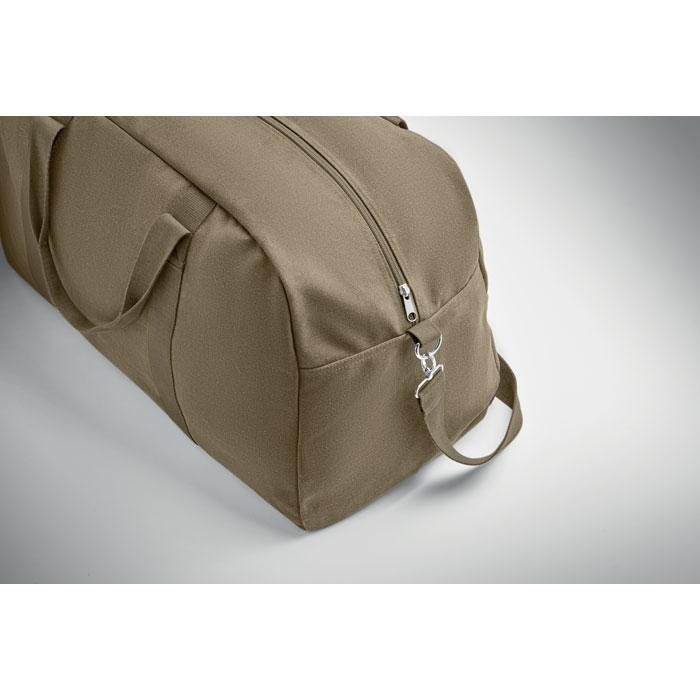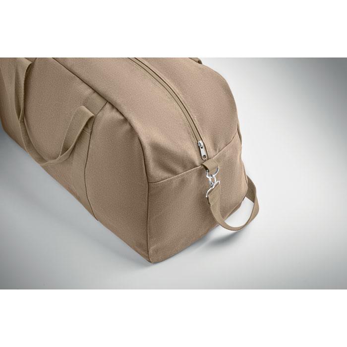 Sac de voyage en tissu recyclé de 450 gr/m² (60% coton recyclé et 40% polyester recyclé) avec sangle en coton réglable et détachable.