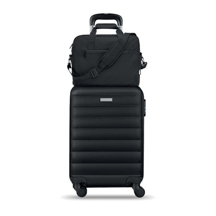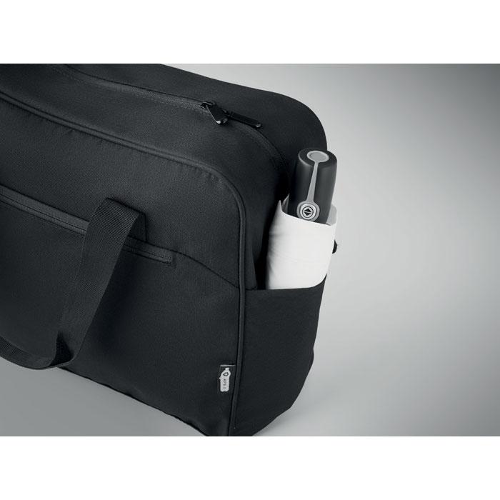 Sac de voyage pour bagage à main en 600D RPET avec grande poche frontale zippée, deux petites poches latérales. Comprend un compartiment pour ordinateur portable de 15 pouces. Bandoulière rembourrée, amovible et réglable. Porte-trolley au verso.