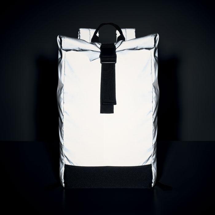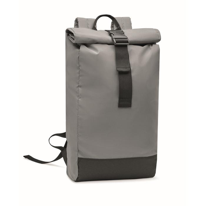 Sac à dos pour ordinateur 15"enroulable en polyester 190T réfléchissant. Poche intérieure à fermeture auto-agrippante. Dos, bretelles et fond rembourrés. Poche frontale zippée. Partie inférieure en polyester recyclé 600D.