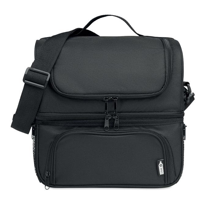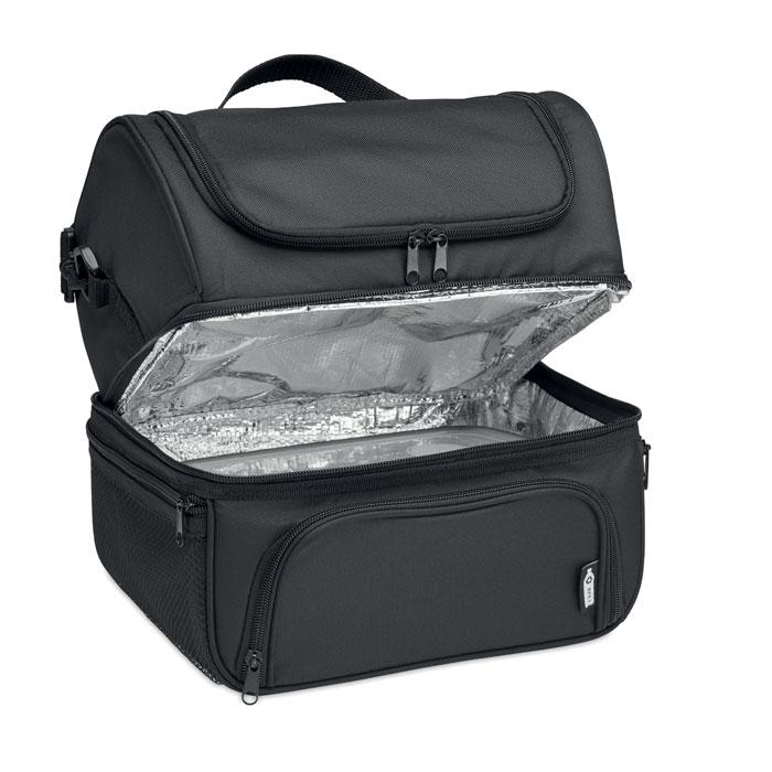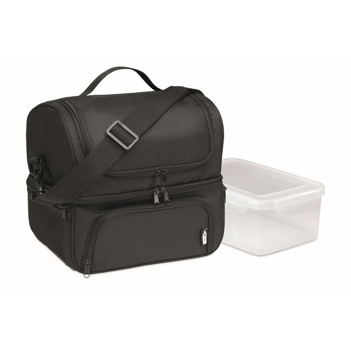 Sac isotherme en RPET 600D comprend une boîte à lunch réutilisable en PP d'une capacité de 1900ml. Avec 2 sections. Bandoulière réglable et détachable. Doublure en aluminium de 2 mm.