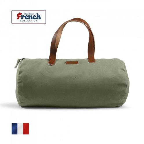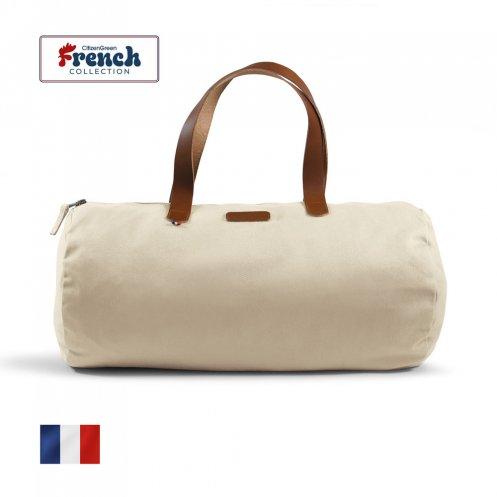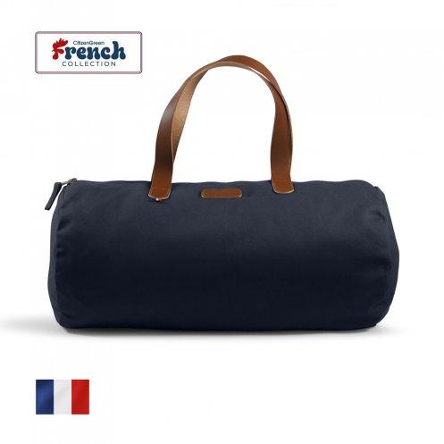Sac polochon coupé et cousu en France, fermeture zippée, attache porte-clés intérieure et dispose de 2 poignées longues 3,5 x 60 cm.