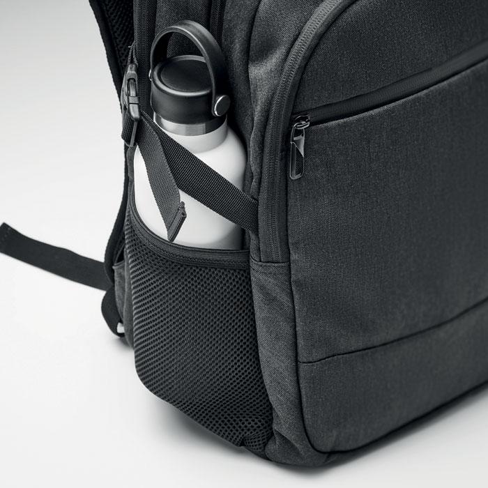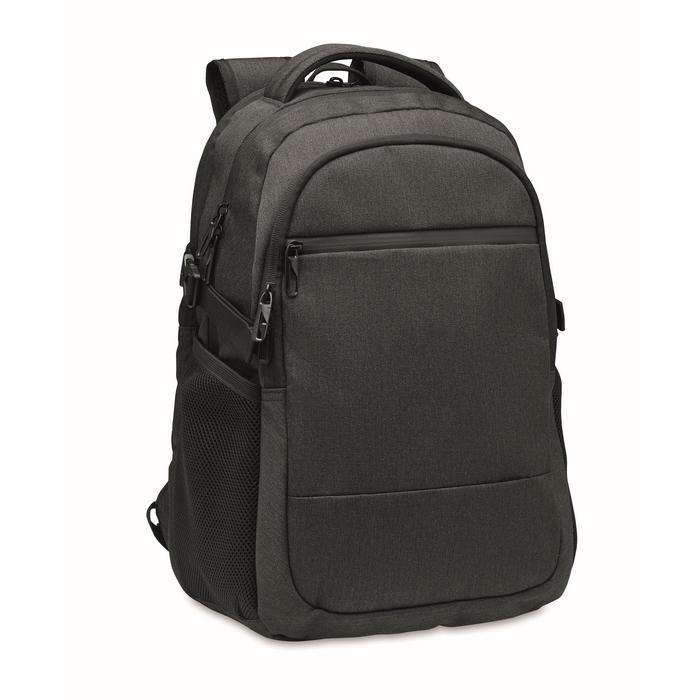 Sac à dos pour ordinateur 15'' en polyester 600D RPET. 3 grands compartiments zippés rembourrés. Deux poches latérales en filet. Bretelles réglables. Partie dorsale en filet rembourrée et aérée. Porte-trolley au dos.