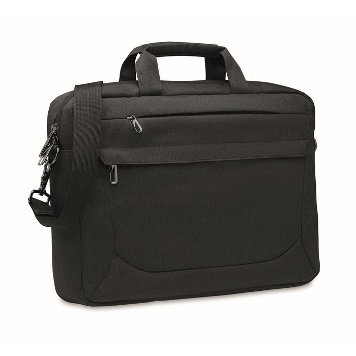 Sacoche ordinateur portable 15'' en polyester 600D RPET. 2 compartiments internes et une grande poche frontale zippée. Une petite poche zippée. Bretelles détachables et réglables. Sangle trolley au dos.