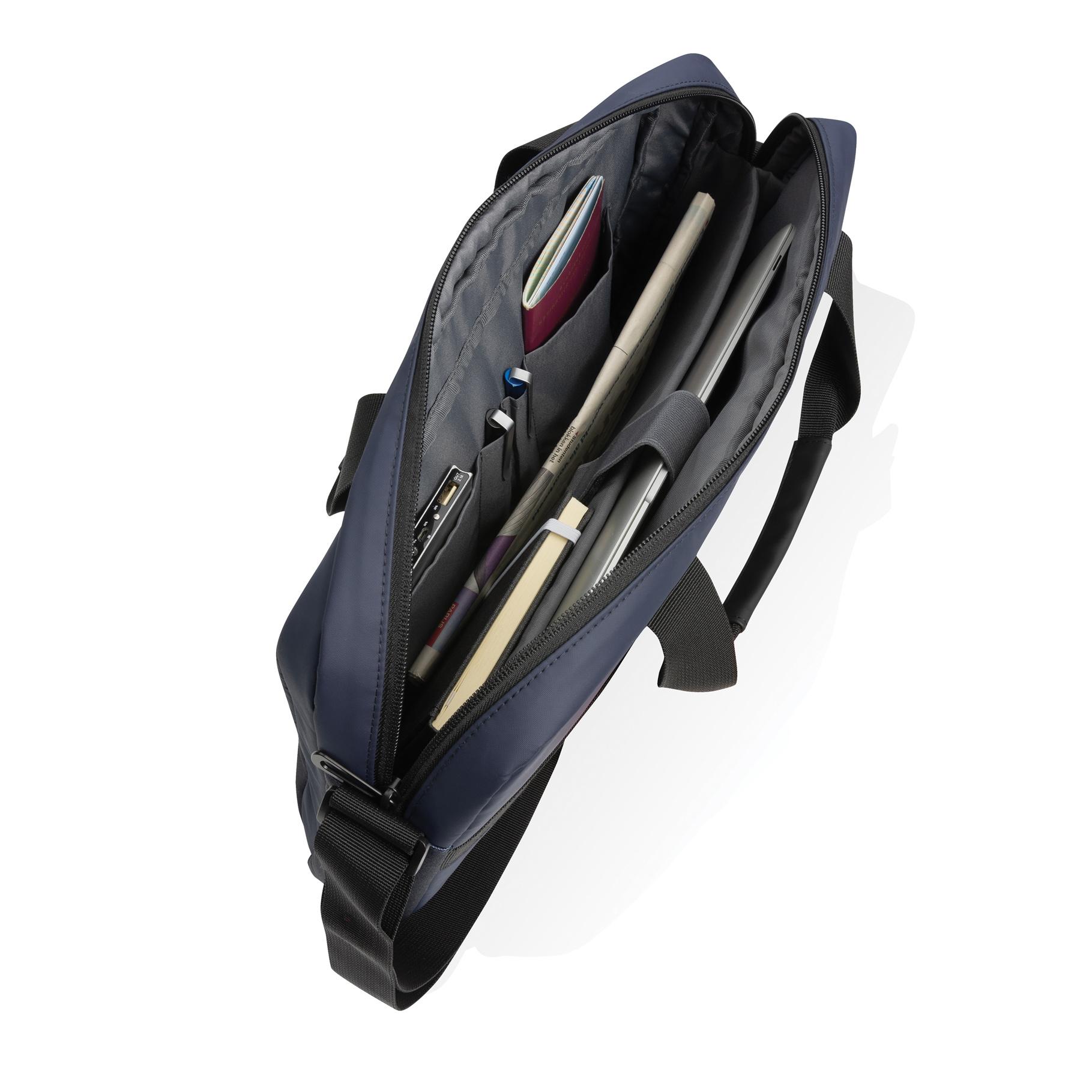 Sacoche Armond pour ordinateur portable de 15,6 pouces est conçue pour le professionnel moderne soucieux de la valeur et de l'environnement. Il présente un design classique avec des coutures apparentes à l'avant, de multiples poches de rangement, deux poignées sur le dessus et une bandoulière réglable et amovible. Fabriqué à partir de polyester recyclé intégrant le traceur AWARE™. 2 % des recettes de chaque produit vendu avec AWARE™ seront reversés à Water.org. Sans PVC.