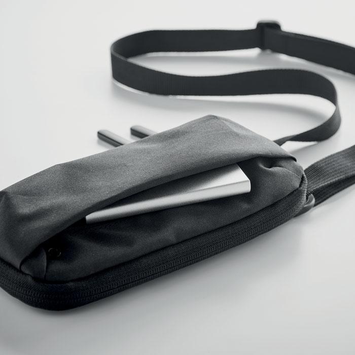 Sacoche pour smartphone en polyester 300D RPET avec bandoulière réglable. Poche frontale et latérale zippées. Le compartiment principal comporte plusieurs poches. Toutes tailles de smartphone.