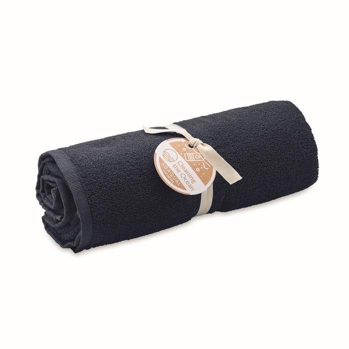 Serviette en 70% coton recyclé et 30% polyester recyclé SEAQUAL®. 500 gr/m². 100x170 cm. SEAQUAL® INITIATIVE travaille avec des entreprises de dépollution des océans dans le monde entier pour valoriser les déchets récupérés. Fabriqué en UE.